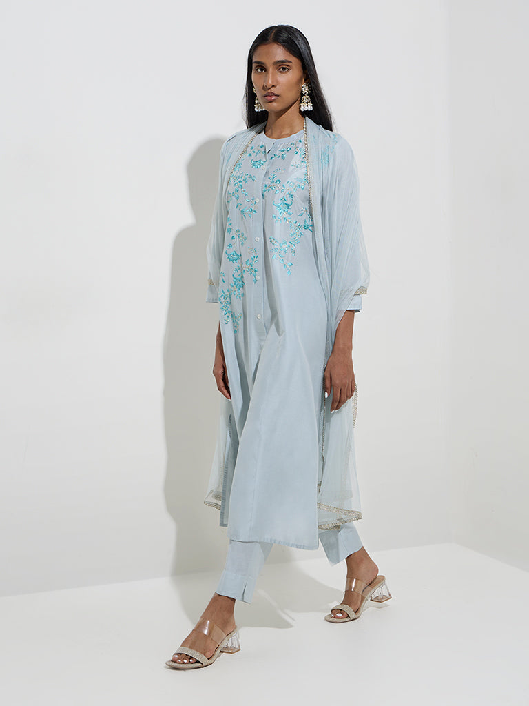 This light blue ethnic set from Vark by Westside features an A-line kurta adorned with elegant gold-tone floral embroidery. Designed with a band-neck collar and three-fourth sleeves. it pairs with ethnic pants featuring a smooth elastic waistband. A net dupatta with zari trims completes the ensemble.