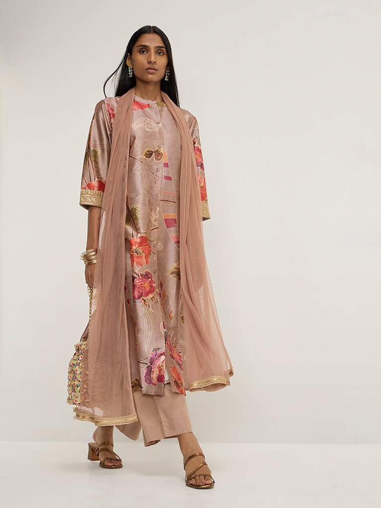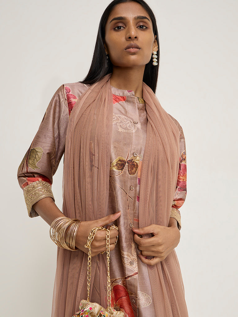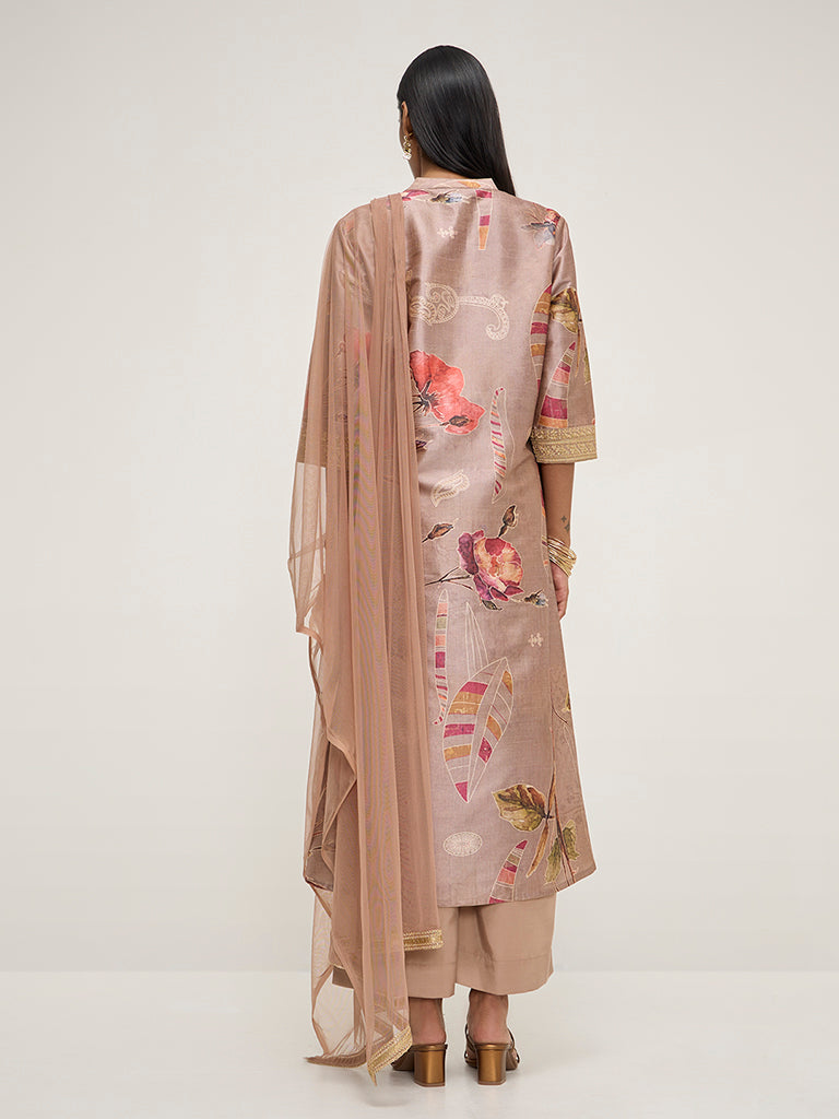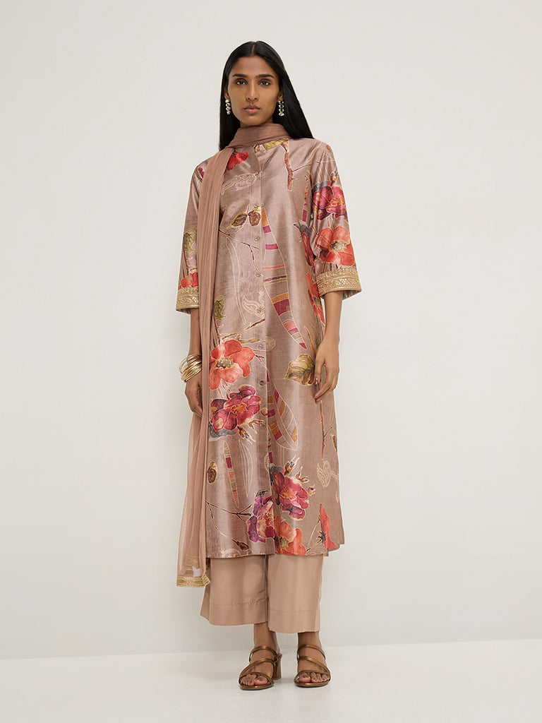 Vark launches this light brown ethnic wear set with appealing floral prints on a soft and breathable fabric composition. Carved in an A-line silhouette. the kurta includes a band collar. button down front and embroidered three-fourth sleeves. It is paired with a high-rise palazzo including smooth elastic waistband for a comfortable fit. The set is finished with a net fabric dupatta adorned with zari-work.