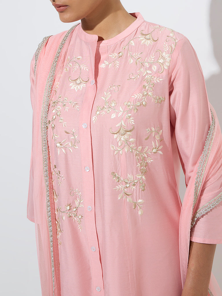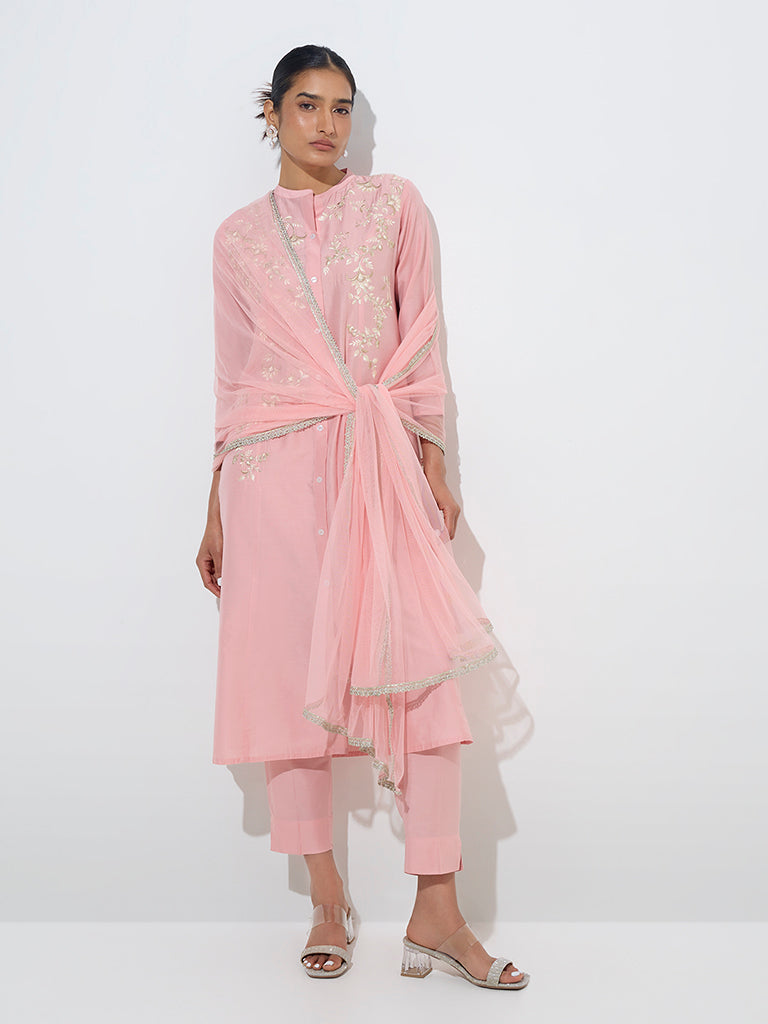 Add a touch of elegance to your ethnic wardrobe with this light pink A-line set from Vark. The kurta is adorned with delicate floral embroidery. a mandarin collar. and a button-up front for a refined look. Three-quarters sleeves lend a graceful charm. while the high-rise pants offer all-day comfort. A lightweight net dupatta completes the ensemble with a hint of ethereal beauty.