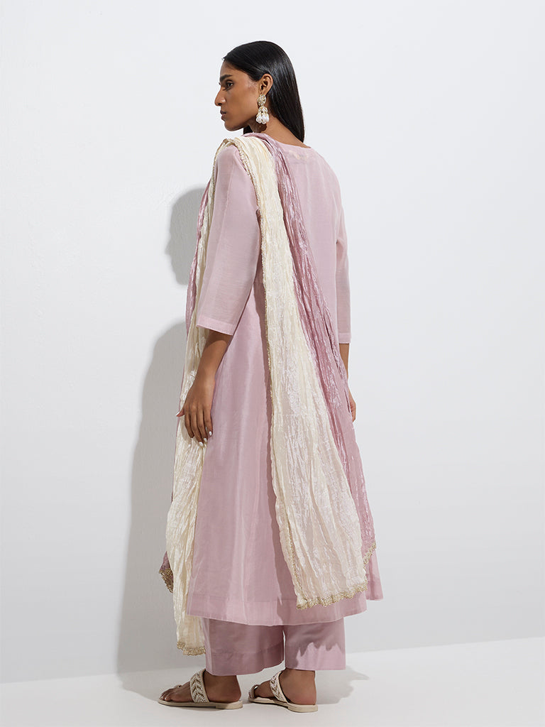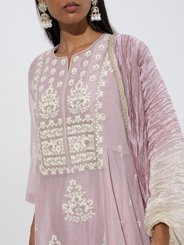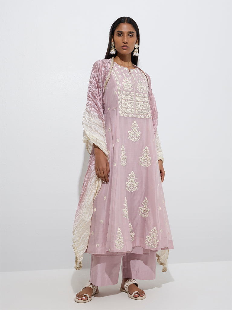 Vark launches this elegant lilac four-piece set created from a soft cotton-blend for all-day comfort. The A-line kurta is detailed with exquisite floral embroidery and styled with a split neck and three-quarter sleeves. It’s layered over a tonal inner and paired with matching palazzos featuring an elasticated waistband for ease. A crushed ombré dupatta with zari trims completes the ensemble. lending a graceful festive flair.