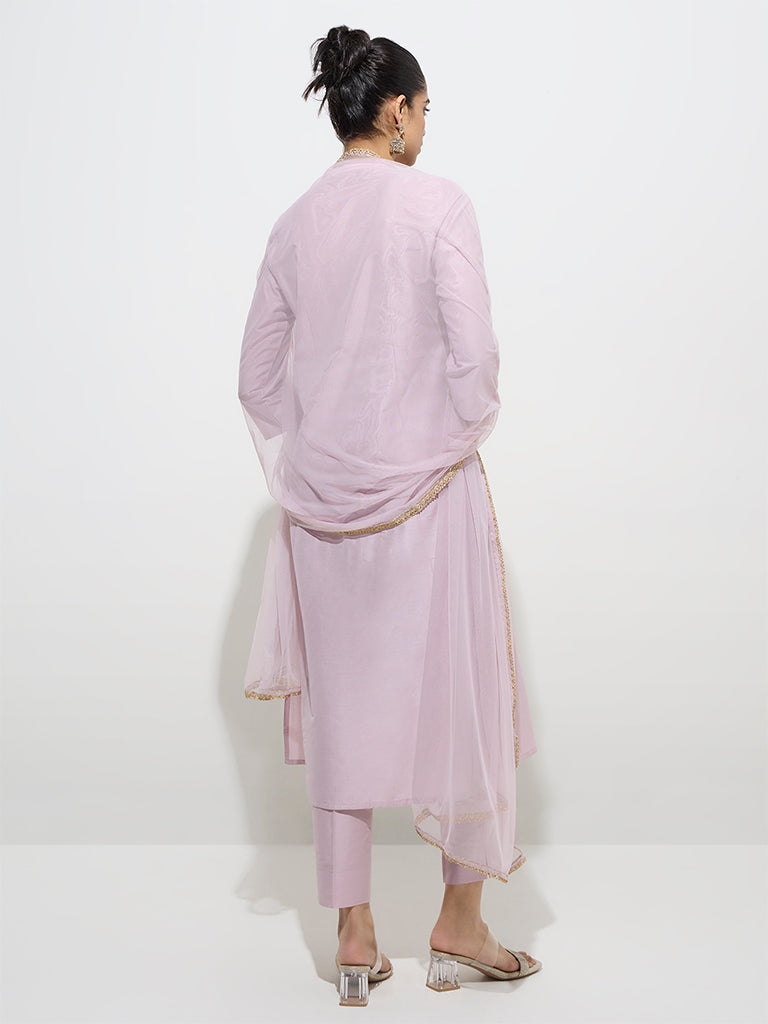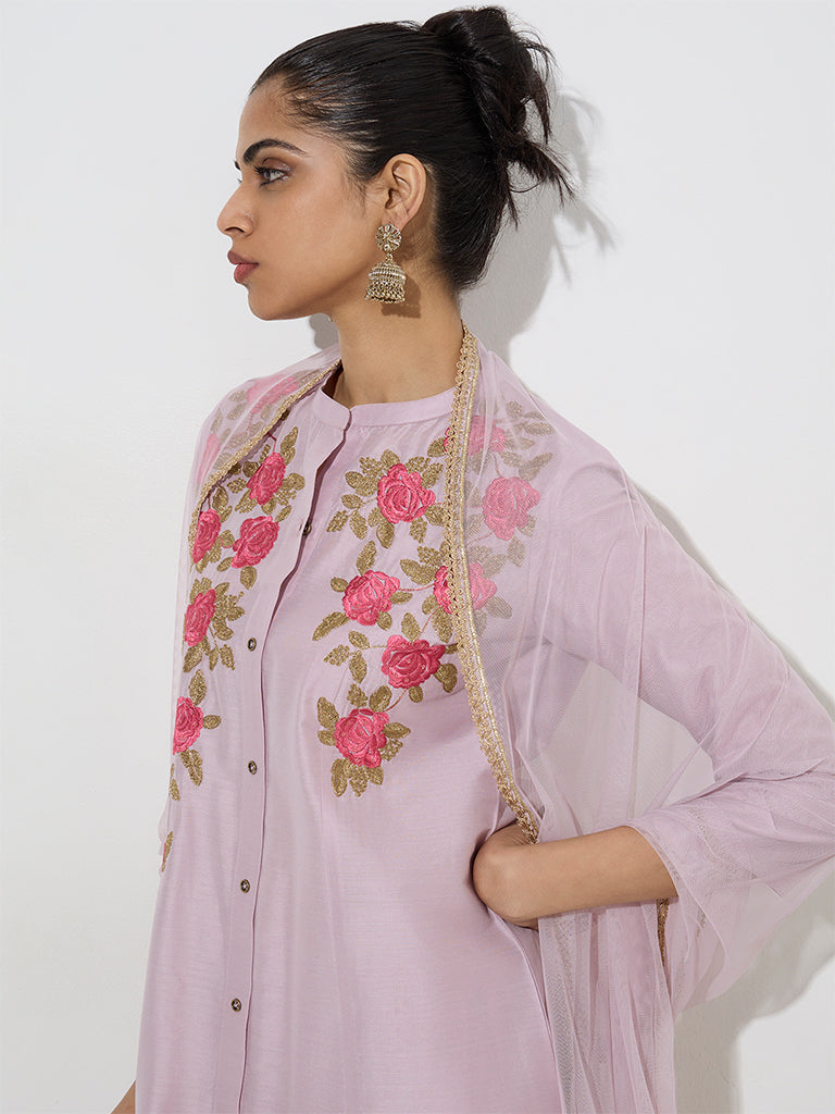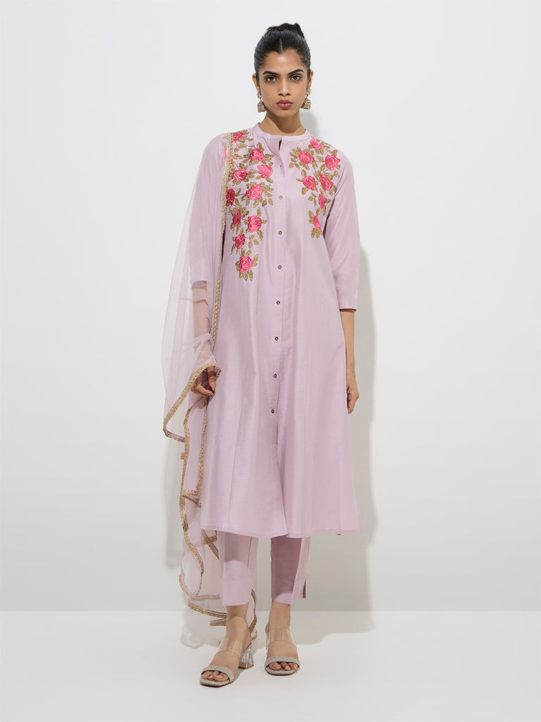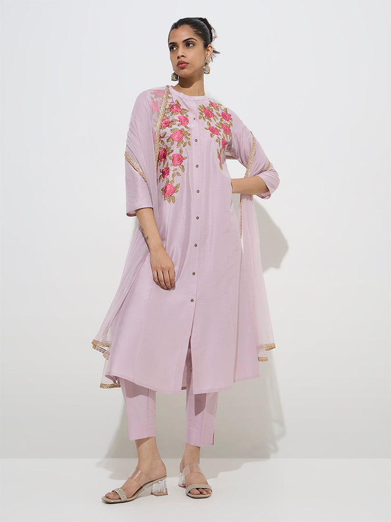 Vark Lilac Embroidered A-Line Kurta. Pants and Dupatta Set
