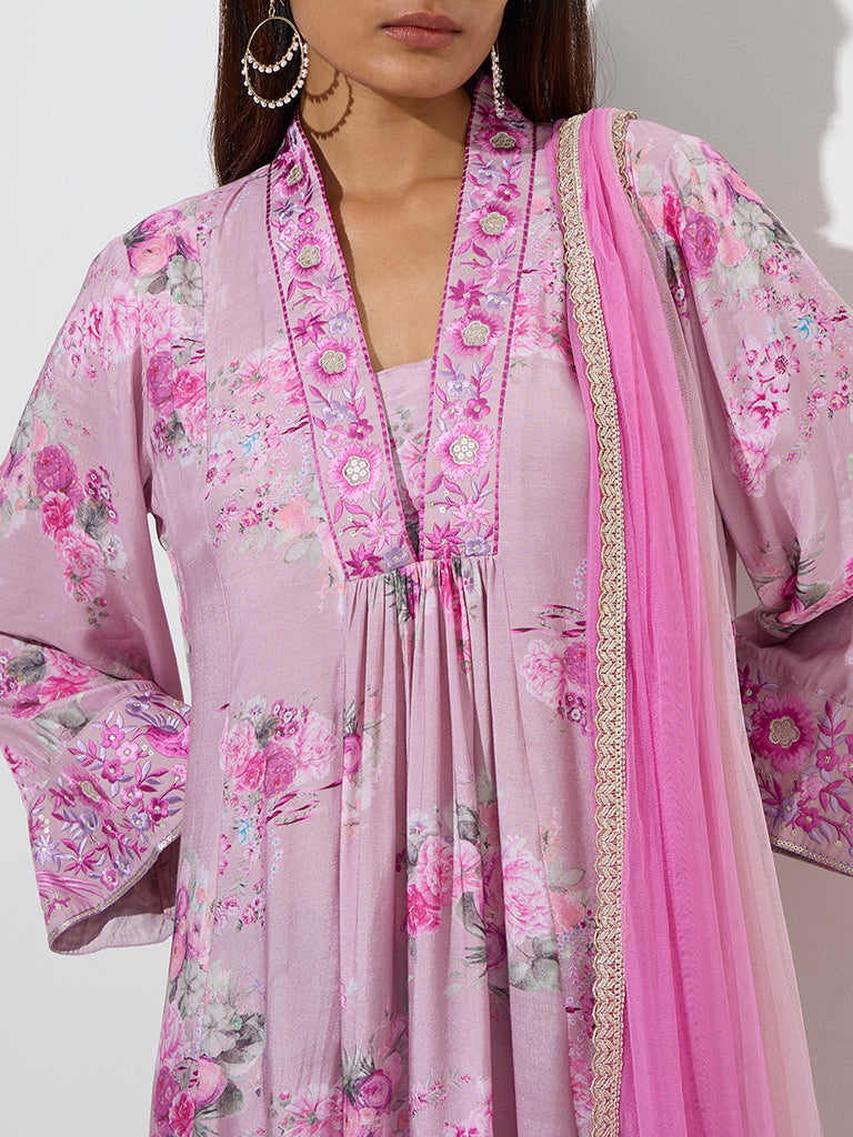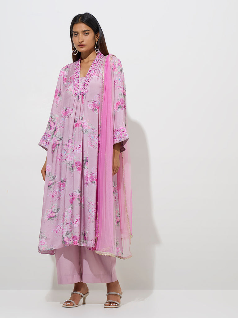 Vark Lilac Floral A-Line Kurta. Palazzos and Dupatta Set