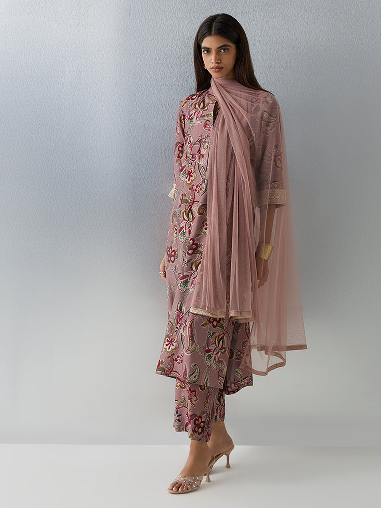 This lilac ethnic set from Vark is crafted from breathable fabric featuring vivid floral patterns for an elegant appeal. The A-line kurta is styled with a band collar. three-quarter sleeves and a button-up front for a refined finish. Completing the ensemble. the coordinated palazzos feature an elasticated waistband for comfort. while the net dupatta—accented with zari embroidery—adds a festive touch. making it perfect for celebratory gatherings.
