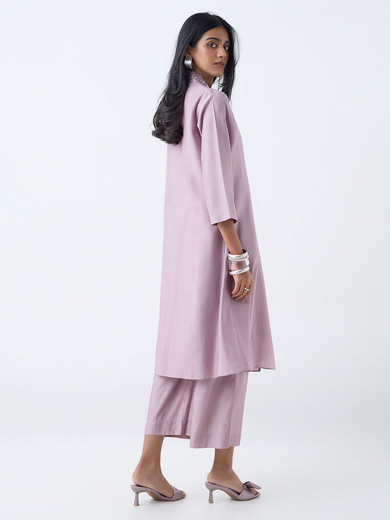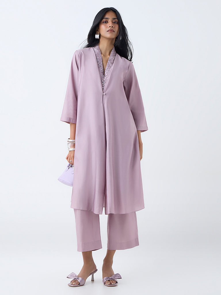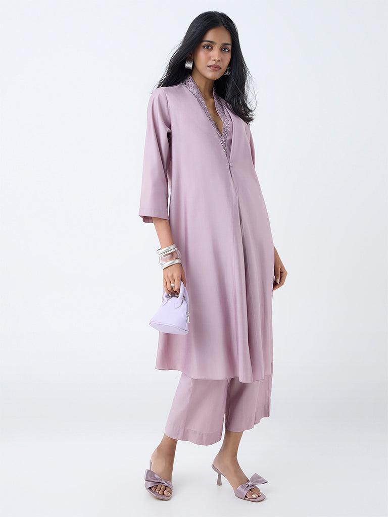 This lilac ethnic set from Vark is a timeless pick for festive evenings and celebratory gatherings. The kurta. cut in a graceful A-line silhouette. features three-quarter sleeves and a V-neckline with delicate sequin embellishments that lend just the right touch of sparkle. Paired with matching pants fitted with an elastic waist for comfort. the ensemble blends ease with elegance.