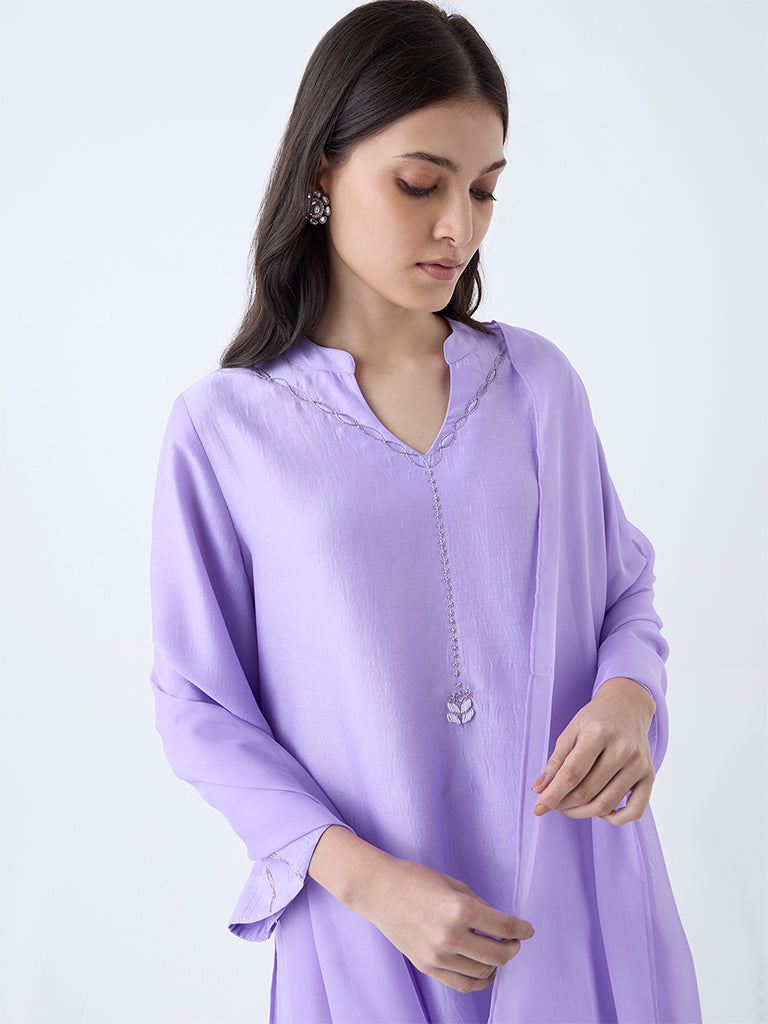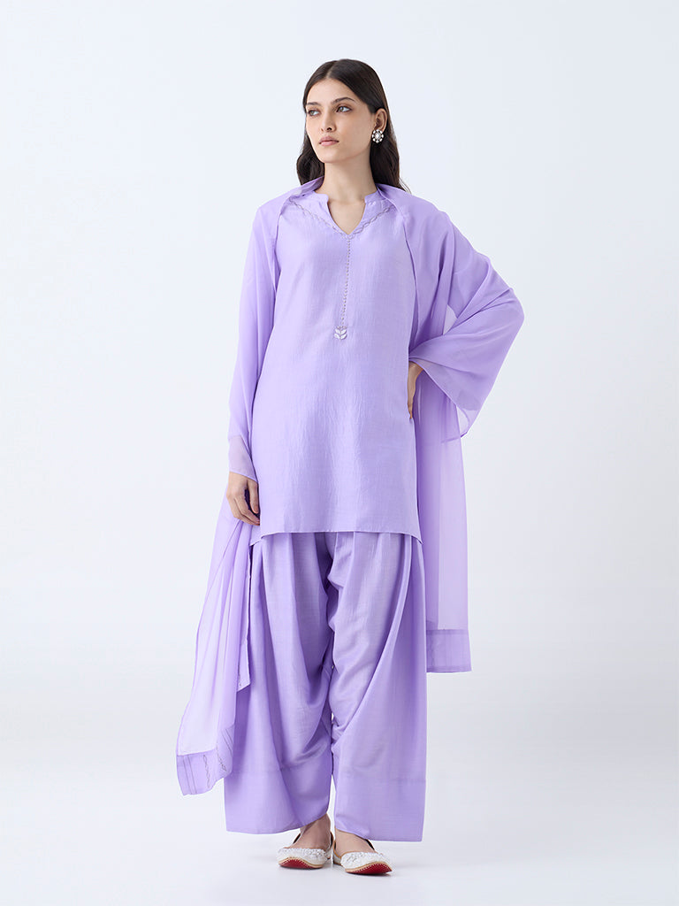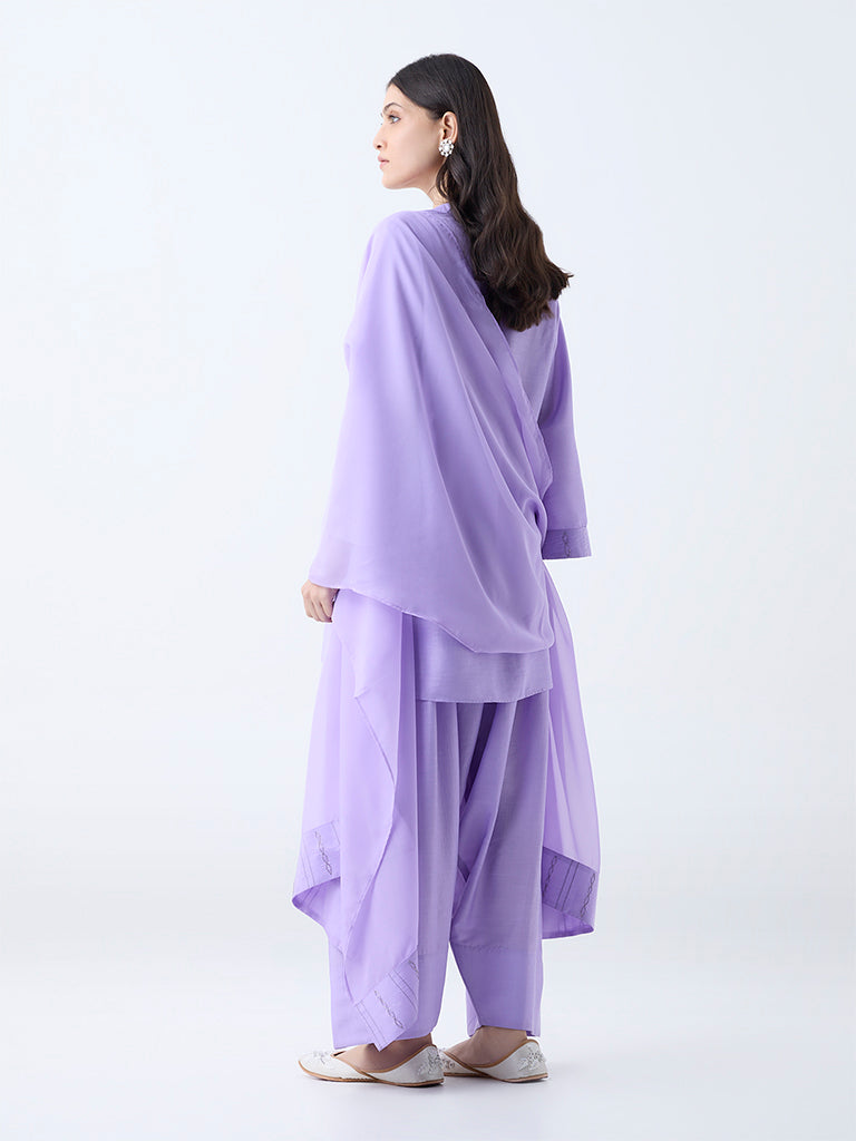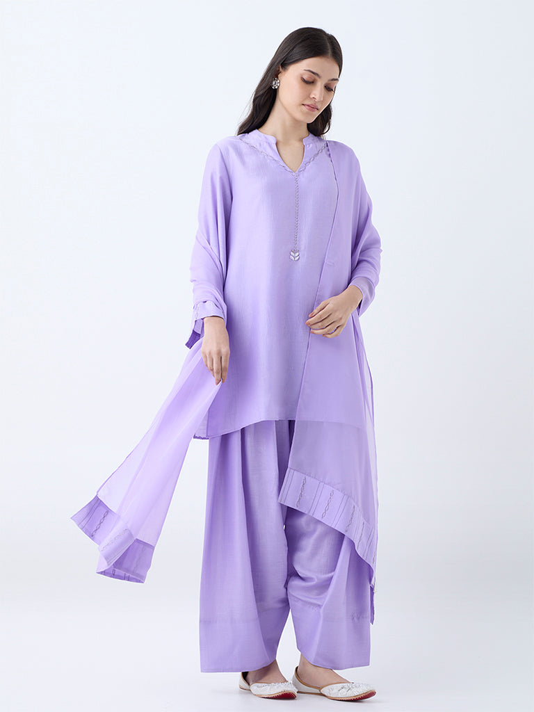 Add a refreshing pastel touch to your festive wardrobe with this lilac ethnic set from Vark. The A-line kurta is styled with a split neck and full sleeves. lending a polished touch to the silhouette. Paired with a coordinated salwar featuring an elasticated waistband and a soft dupatta that drapes with finesse. this ensemble is a perfect blend of subtle elegance and festive charm.
