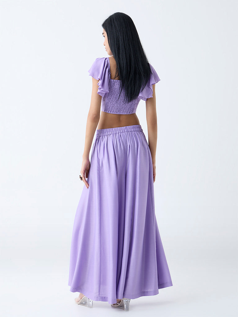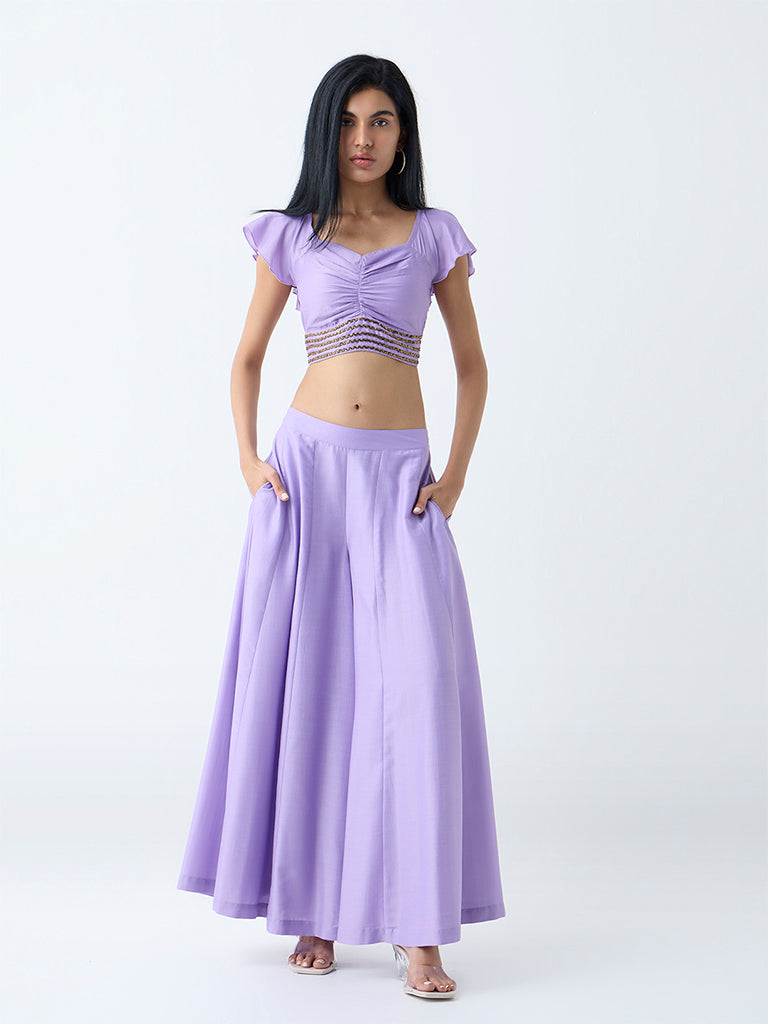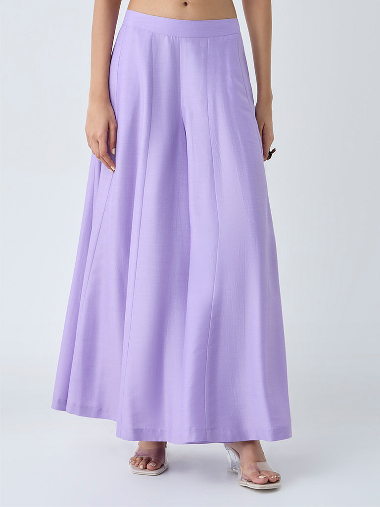 These lilac solid palazzos from Vark showcase a flared silhouette with an elasticated waistband and side pockets. Cut from an ultra-lightweight fabric for easy movement. they bring comfort and ease to festive pairings.