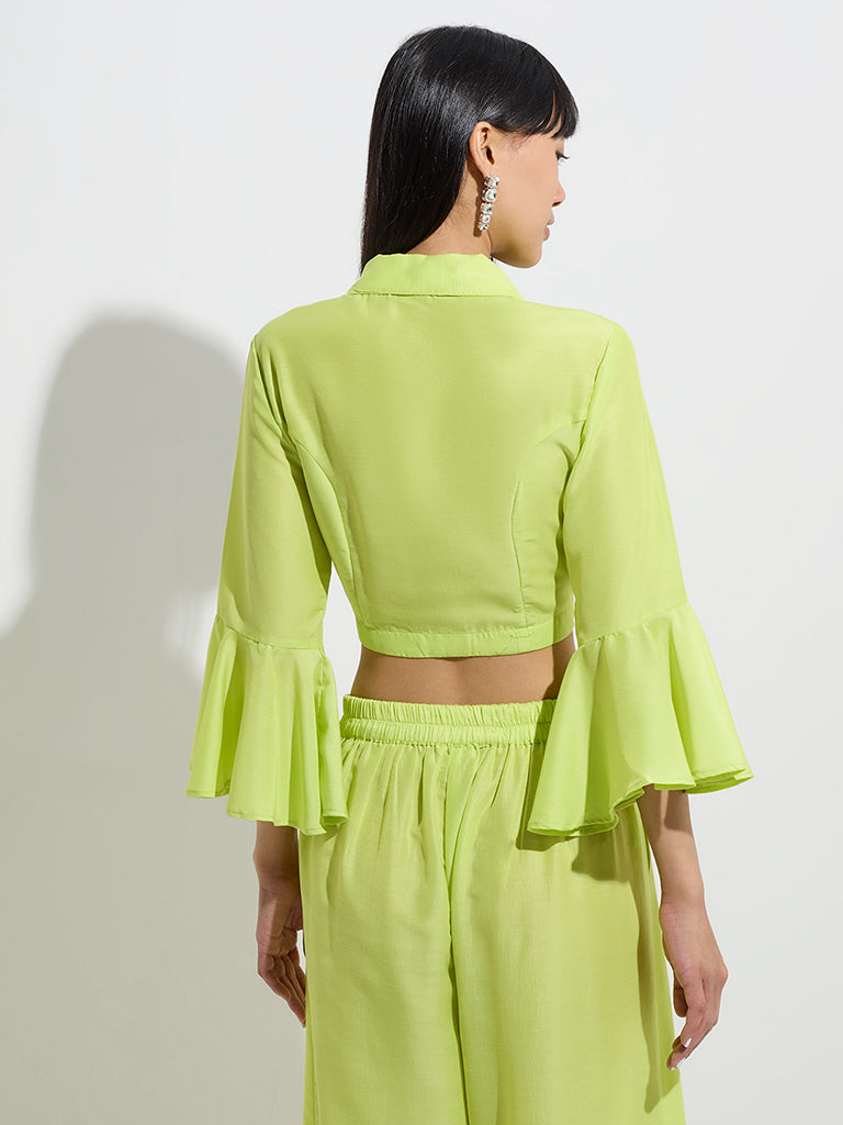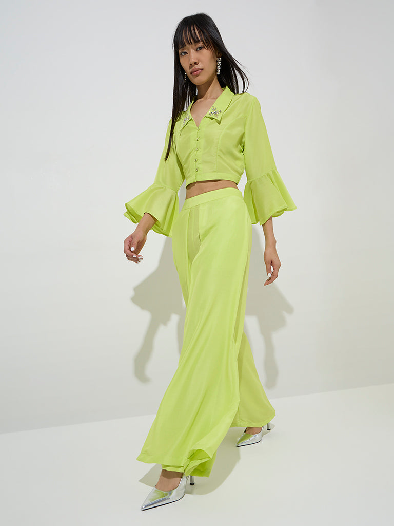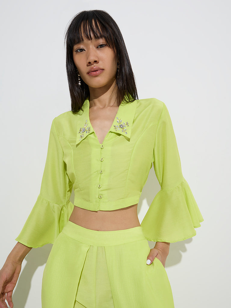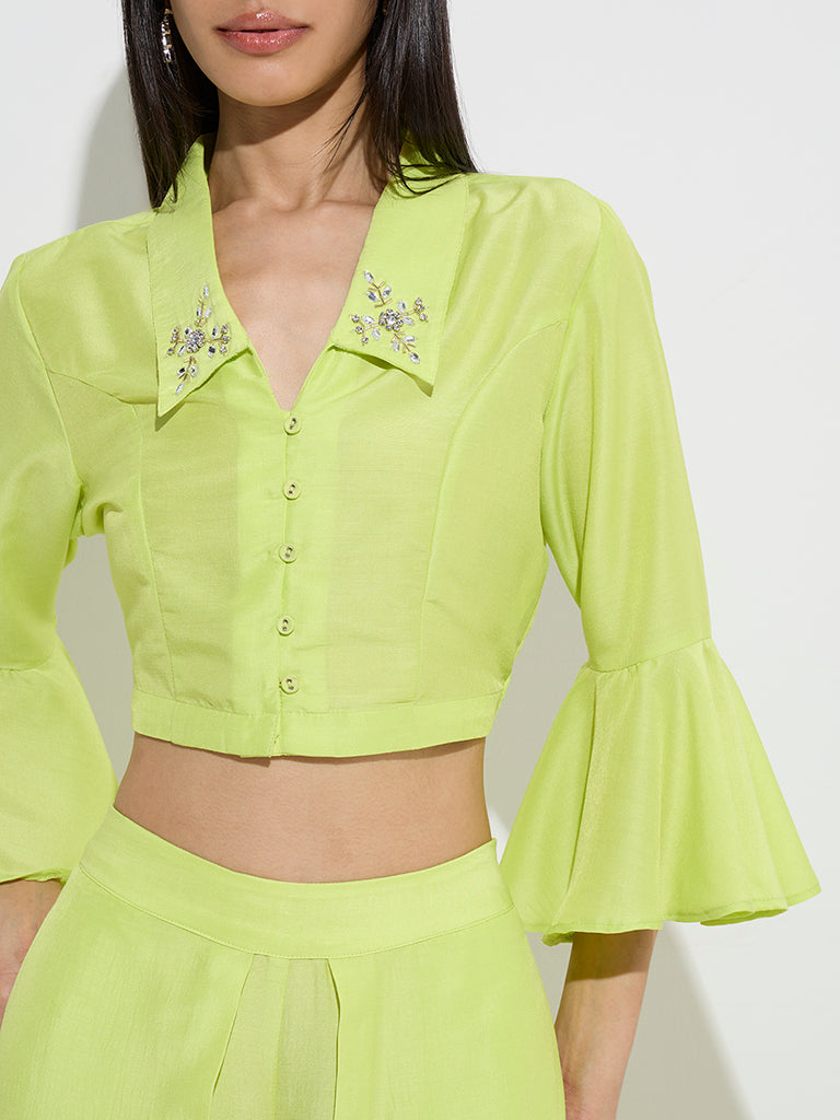 This lime ethnic top from Vark features an elegantly embellished spread collar for a refined touch. Designed with a button placket and flute sleeves. it adds graceful charm to your ensemble.