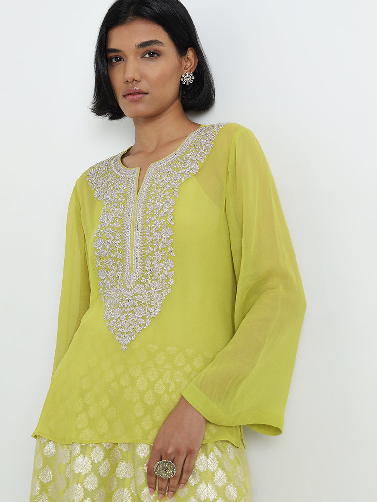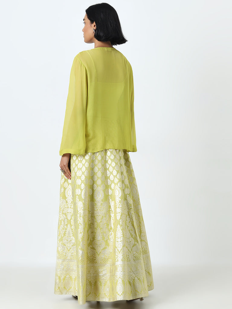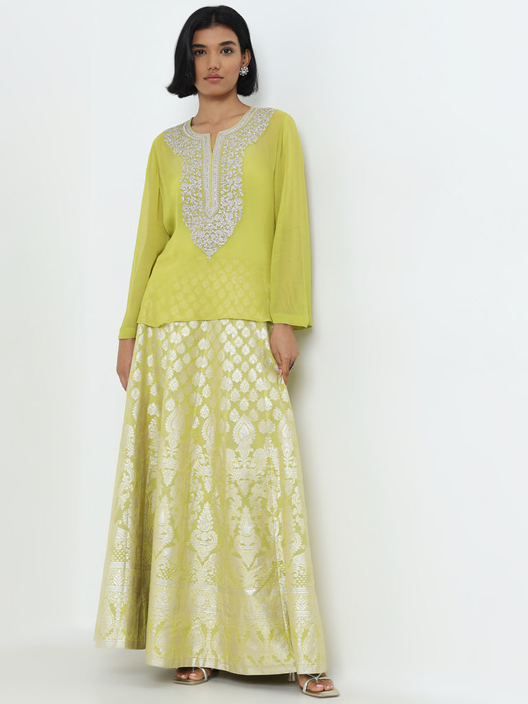 Vark Lime Embroidered Top with Inner and Brocade Skirt Set