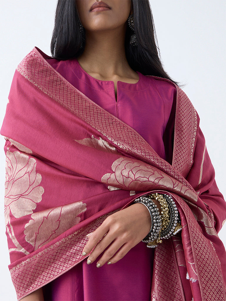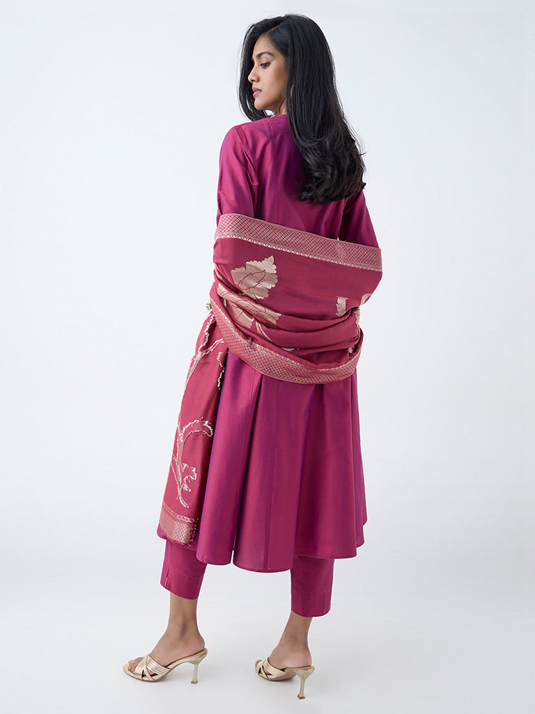 When celebrations are on the horizon. this magenta ethnic set from Vark brings effortless elegance to the forefront. The flowing Anarkali kurta. styled with a split neckline and three-quarter sleeves. creates a refined silhouette that moves with grace. Coordinated pants with an elasticated waistband add comfort to the charm. while the soft dupatta. adorned with brocade motifs. completes the look with festive finesse.