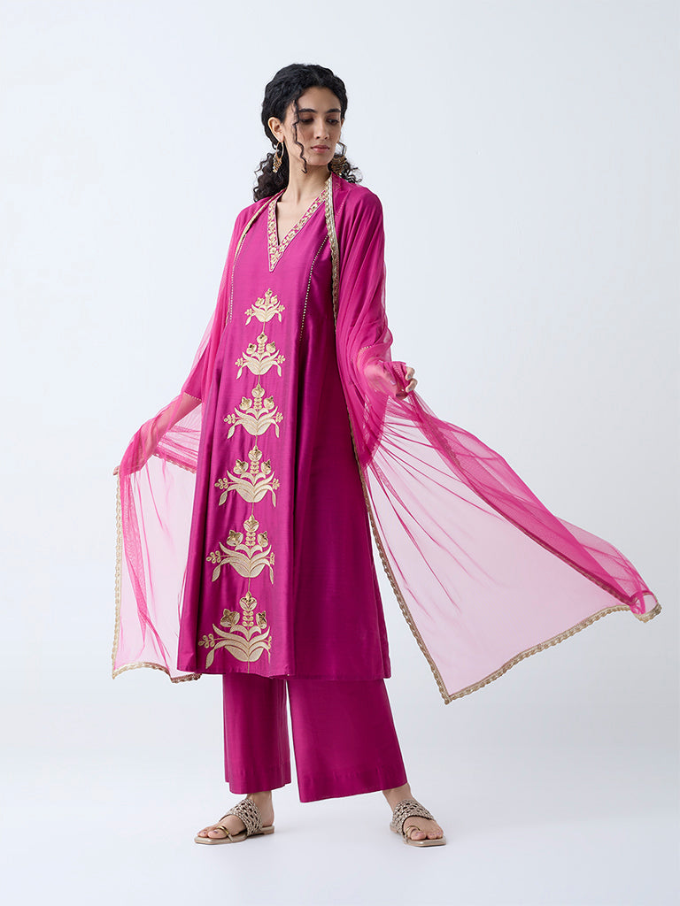 This magenta ethnic set from Vark features an A-line kurta adorned with intricate embroidery and styled with a flattering V-neck and three-quarter sleeves for an elegant look. Spun from a lightweight fabric. it is paired with coordinated palazzos for ease and movement. A sheer net dupatta adds a graceful finishing touch. making this ensemble a standout choice for festive celebrations.
