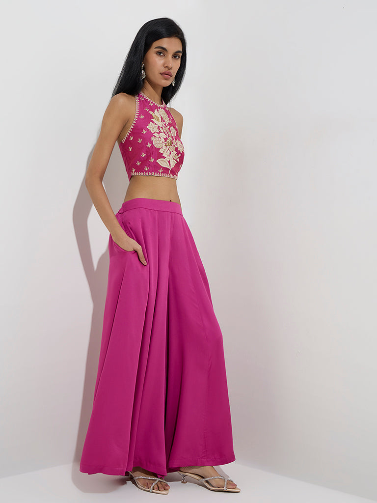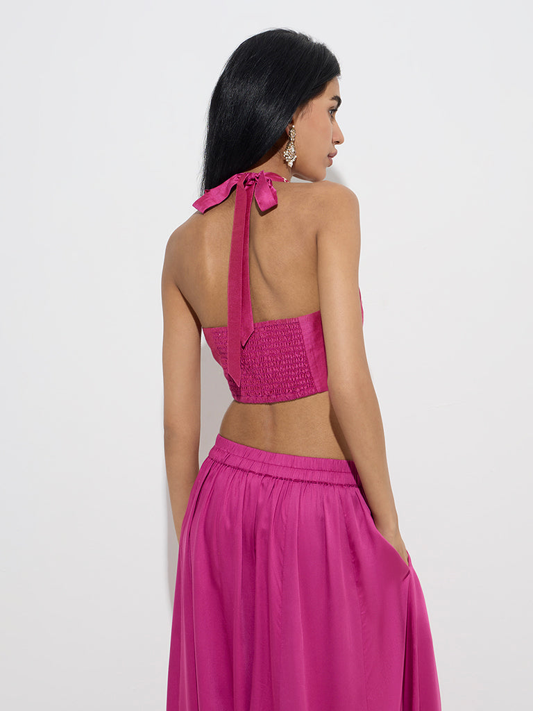 Feminine and festive. this magenta top from Vark brings together delicate embroidery and subtle sequin embellishments for a refined touch of sparkle. Crafted from a high-quality fabric. it features a halter neckline with a tie-up back and a smocked panel that ensures a flattering fit.