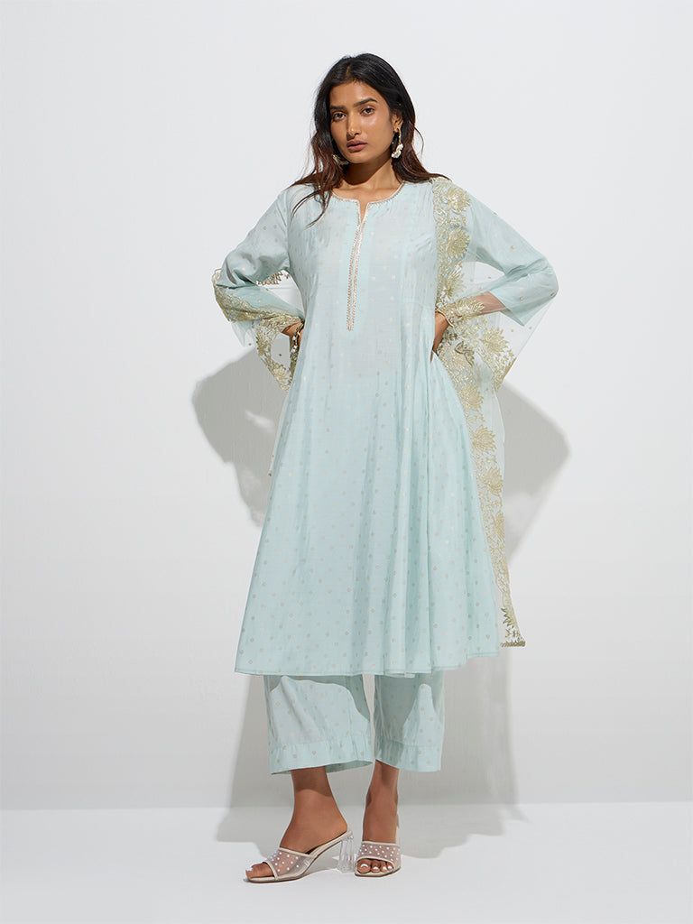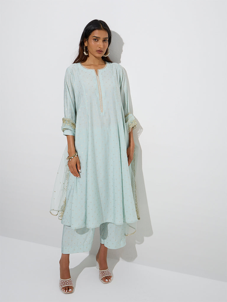 Vark Mint Printed A-Line Kurta. Palazzos and Dupatta Set