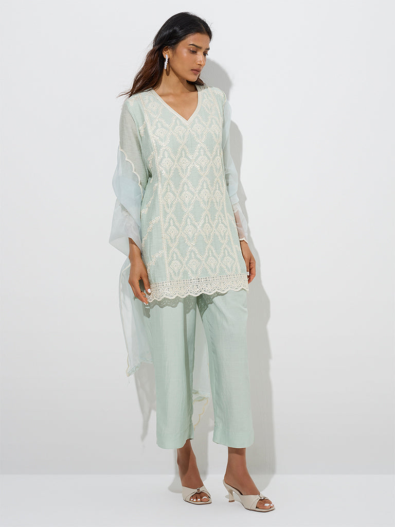 This elegant mint ethnic set from Vark is woven from a lightweight fabric for superior comfort. The kurti is adorned with delicate embroidery and features a flattering V-neck and three-quarter sleeves. Paired with matching palazzos that feature an elasticized waist for ease. the set is completed with a net dupatta. beautifully highlighted with scalloped trims for a graceful finish.