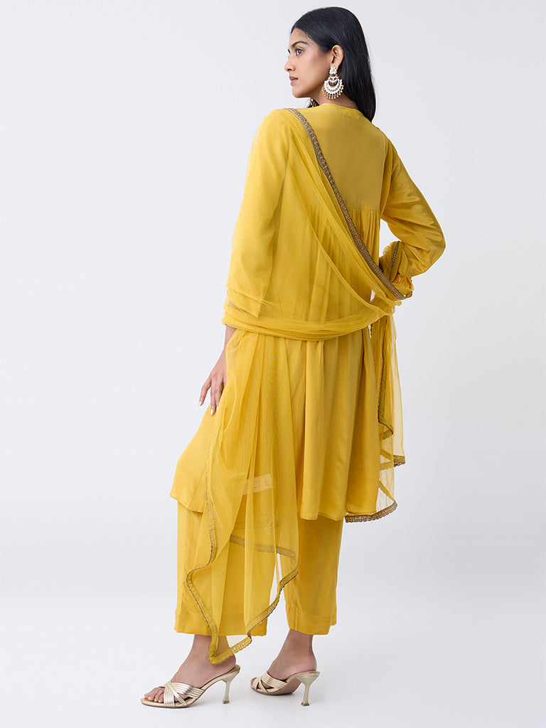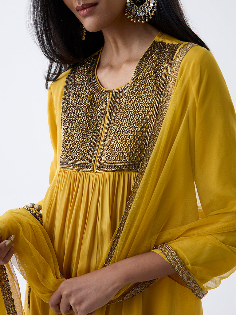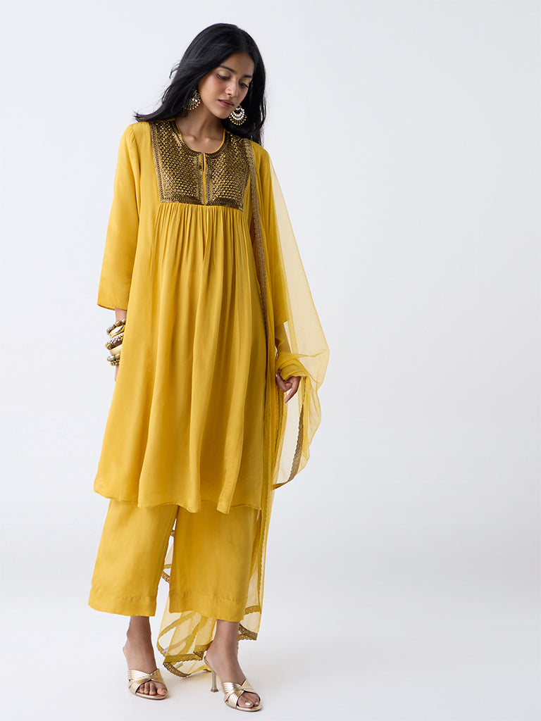 Sunlit celebrations and festive soirées feel brighter with this mustard ethnic set from Vark. The A-line kurta highlights intricate embellishments across the yoke and is complemented by a split-neck and three-quarter sleeves. Coordinated palazzos with an elasticated waistband promise comfort. while the net dupatta. detailed with striking zari embroidery. completes the ensemble.