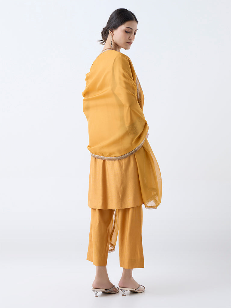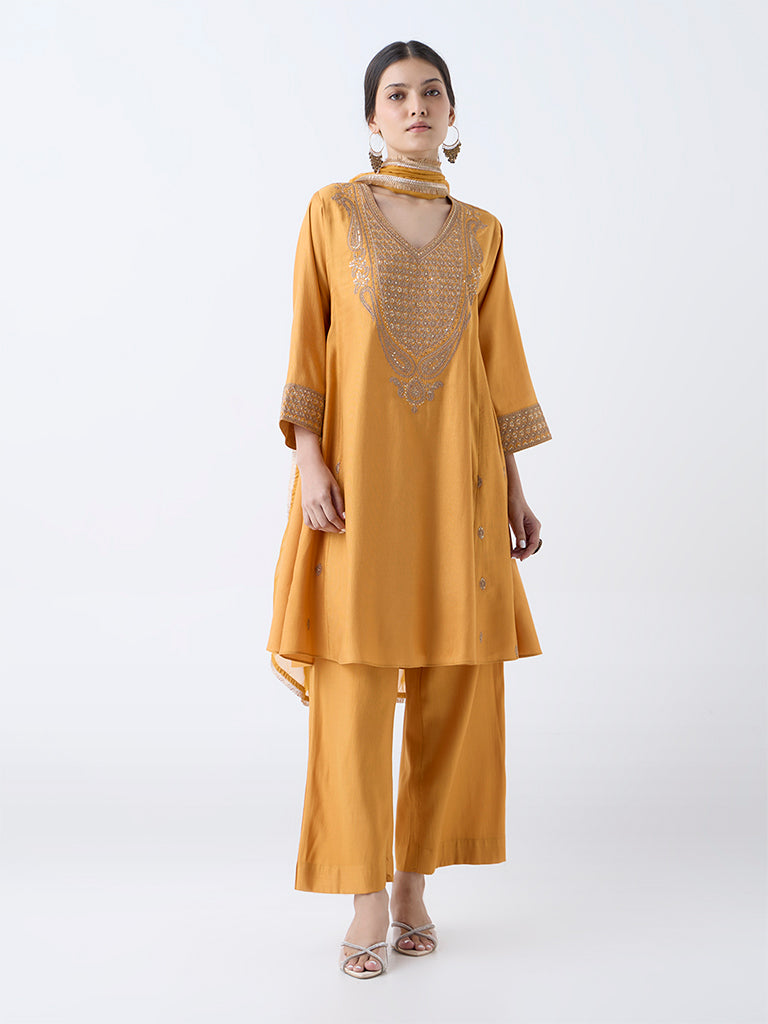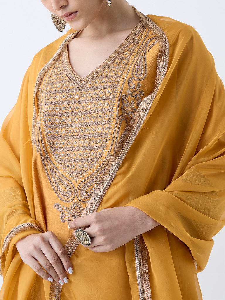 Add a regal touch to your festivities with this mustard ethnic set from Vark. The A-line kurta is woven from Garwal tissue. known for its delicate sheen. and intricately embroidered with sequin work across the bodice. A sculpted V-neck enhances the feminine silhouette. while coordinating ethnic pants with a smooth elasticated waistband ensure ease of wear. The look is completed with a matching dupatta. edged in zari trims that lend a touch of traditional opulence.