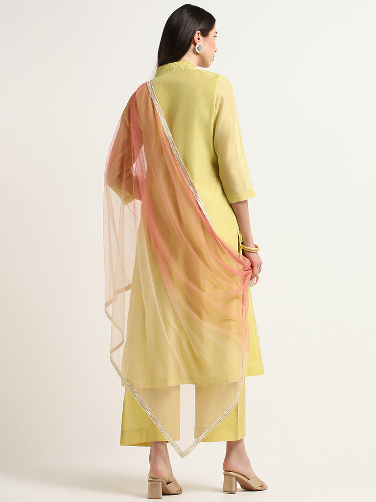Mustard hue. floral embroidered. V-neckline. three-quarter sleeves kurta. pants in mid-rise. elastic waistband and adjustable cords. and shaded net dupatta by Vark.