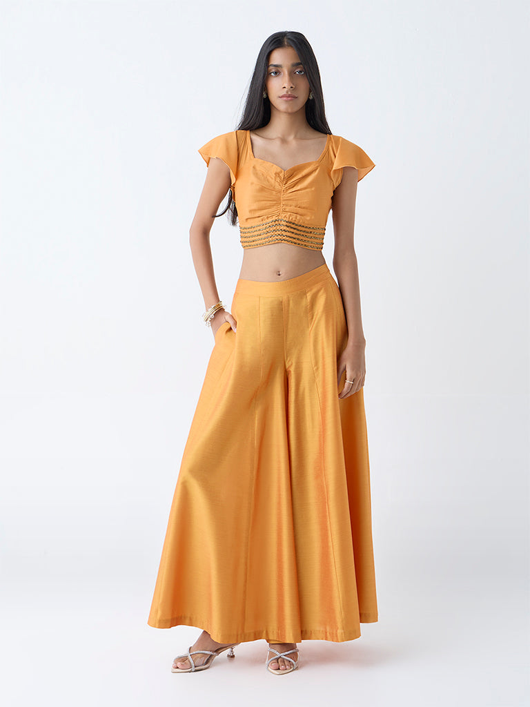 Celebrate in colour with this mustard ethnic top from Vark. Framed with a flattering sweetheart neck and butterfly sleeves. this lightweight piece features a ruched bodice and a smocked back for comfort. Exquisite embellishments adds just the right amount of festive sparkle. perfect for pairing with statement bottoms for day-to-evening celebrations.