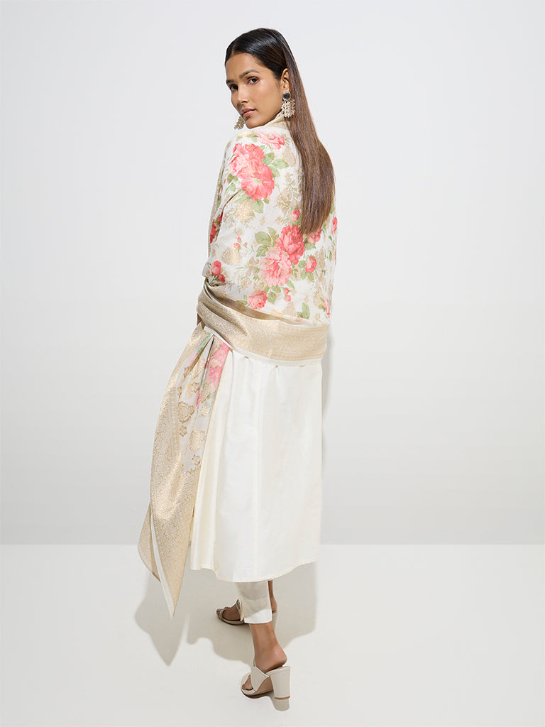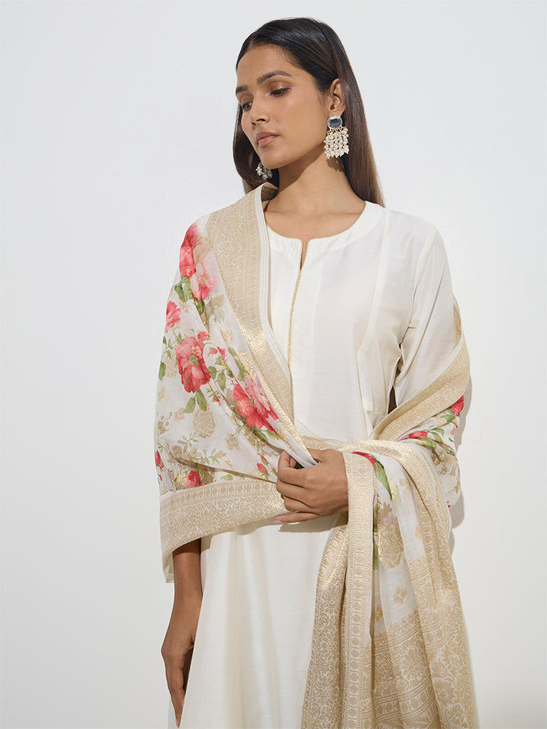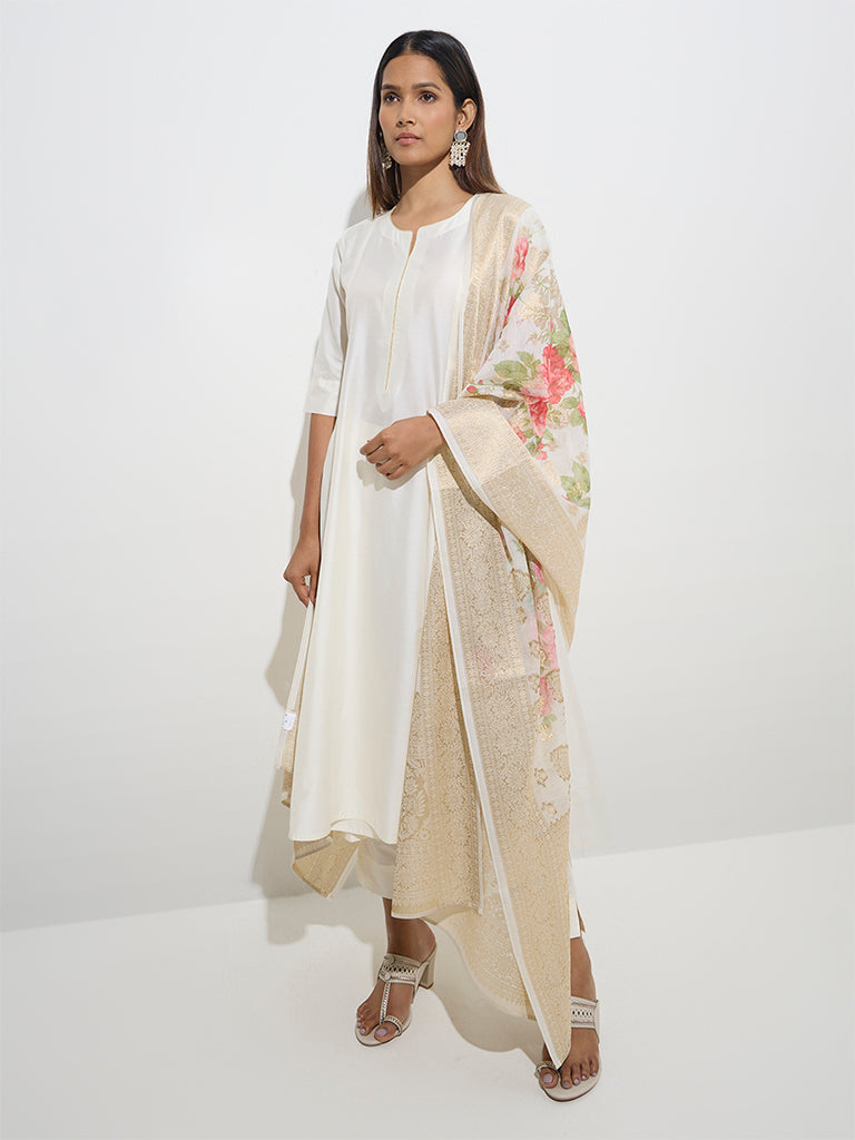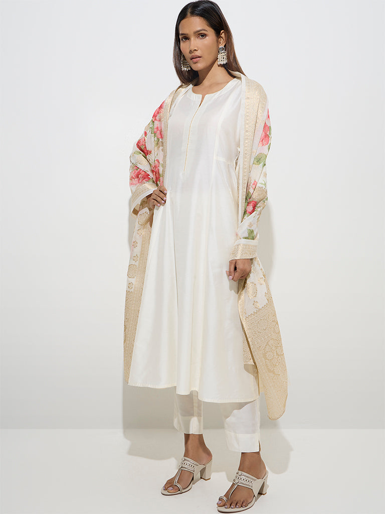 Vark Off-White A-Line Kurta. Pants and Floral Dupatta Set