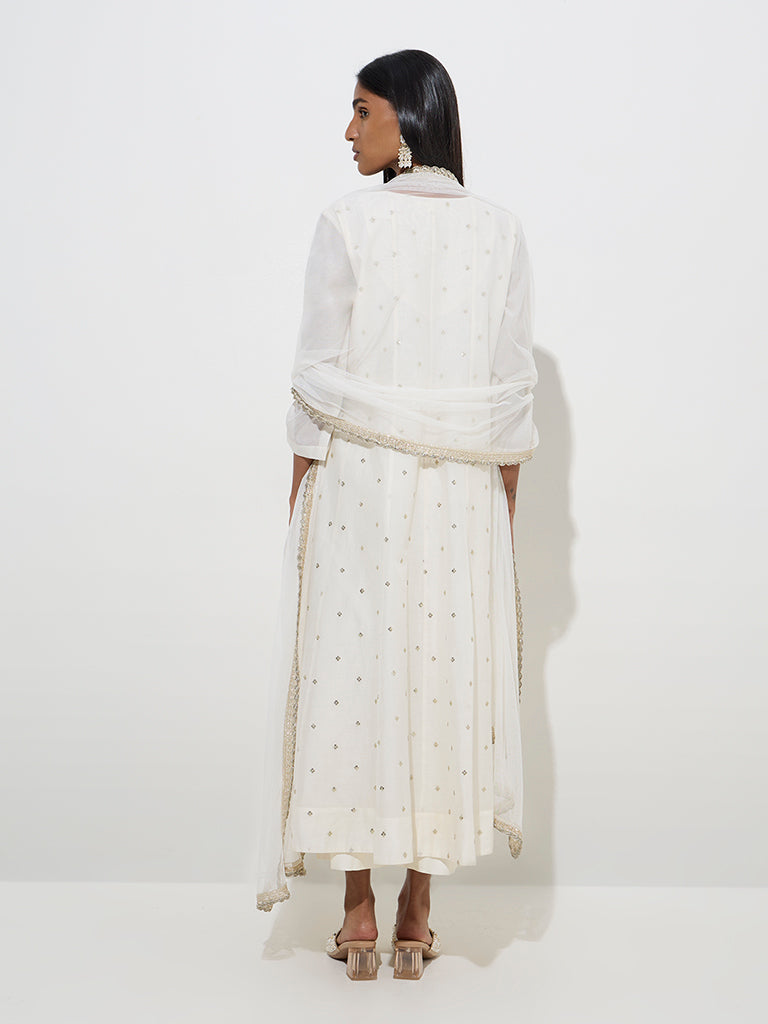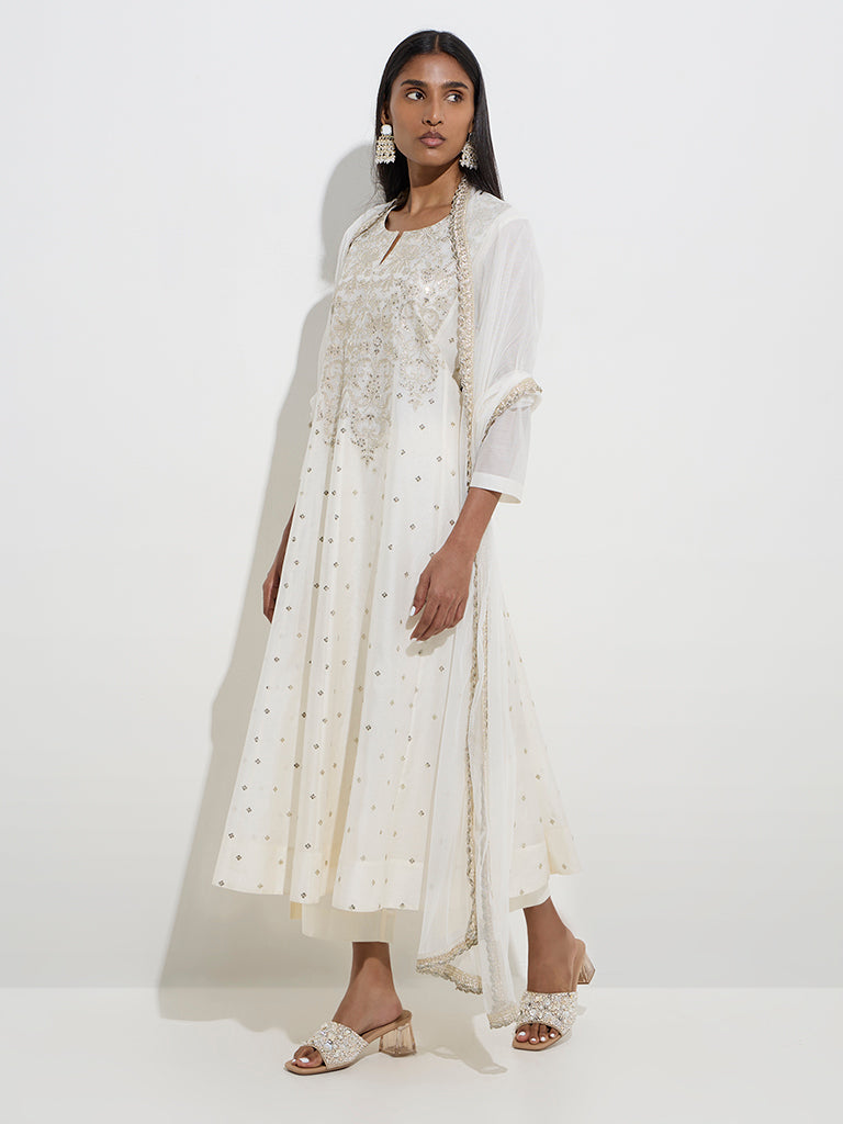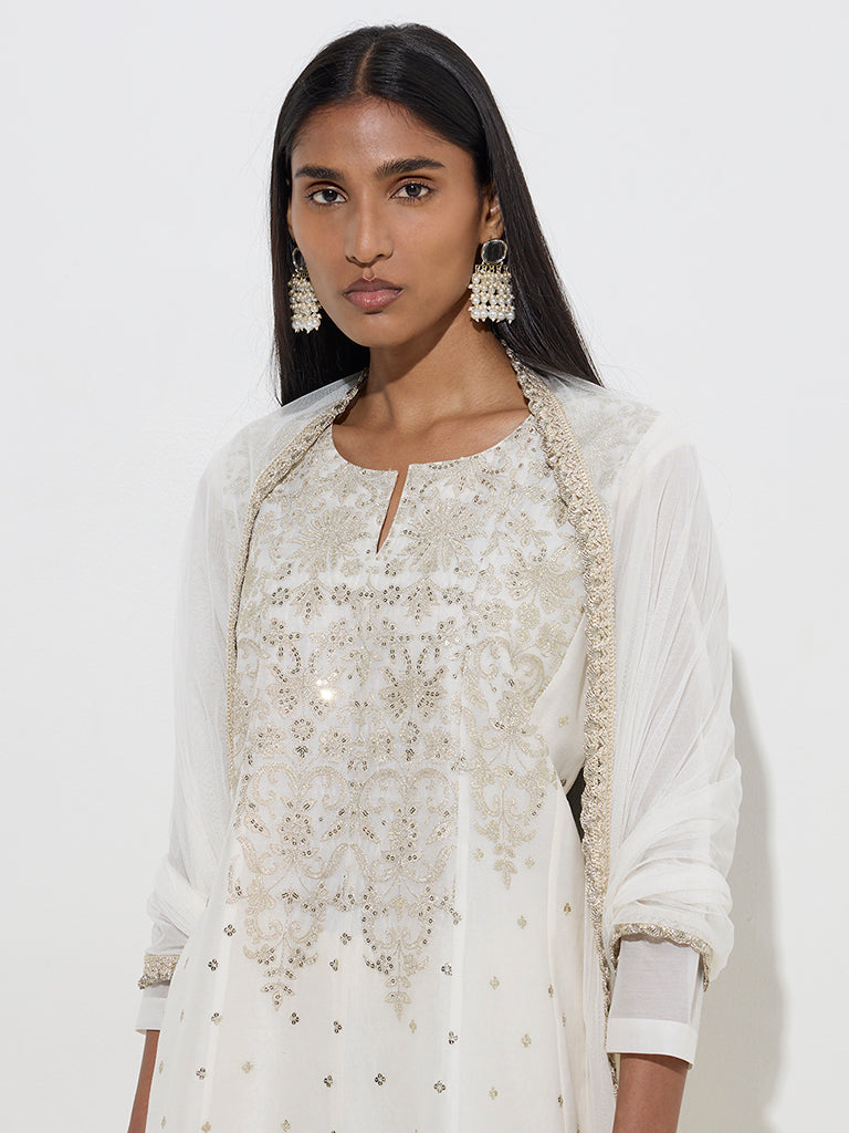 Vark Off-White Cotton-Blend Kurta. Palazzos and Dupatta Set