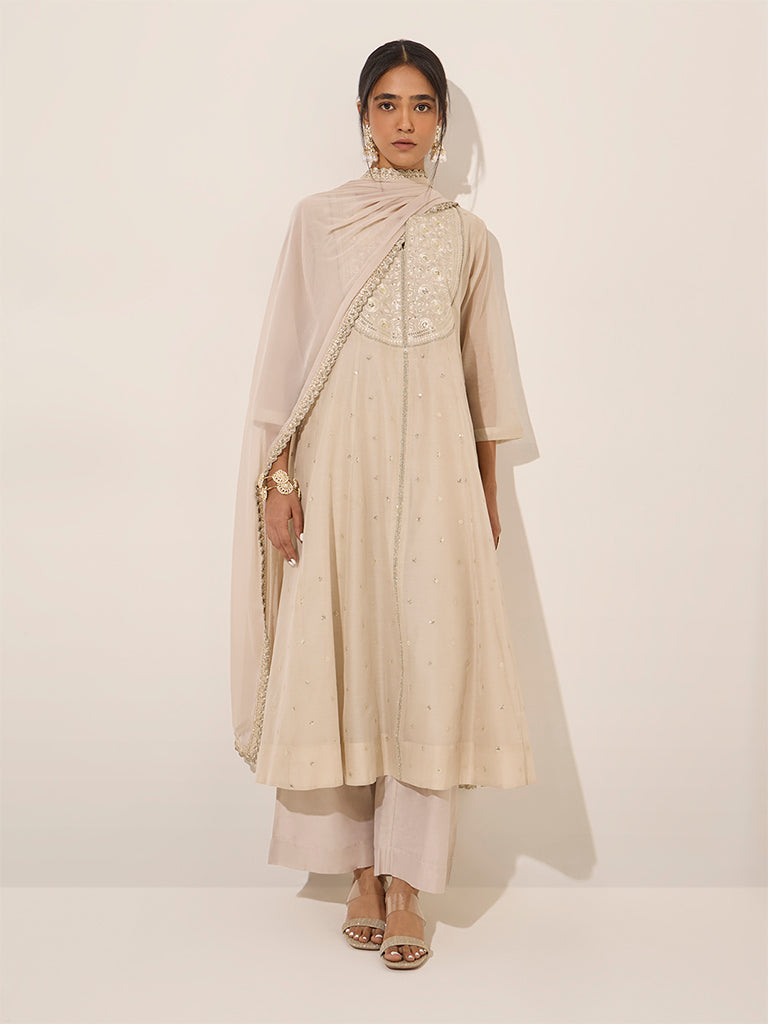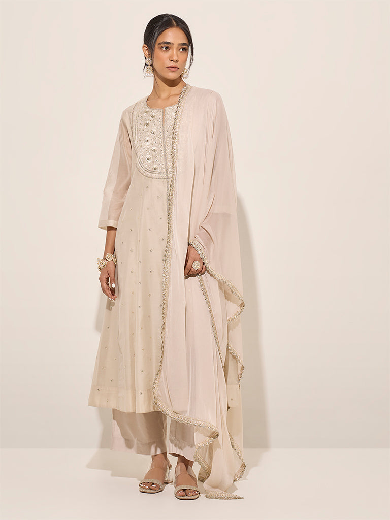 Vark Off-White Embellished Cotton-Blend A-Line Kurta. Palazzos and Dupatta Set