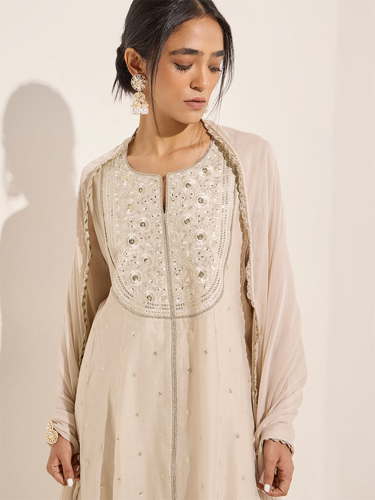 Vark presents this elegant off-white embellished set. perfect for special occasions. The A-line kurta features delicate embellishments. a split neckline. and full sleeves for a refined look. Paired with high-rise palazzos designed with a smooth elastic waistband. this set is both comfortable and stylish. The matching dupatta. adorned with a zari-embroidered hemline. completes the ensemble with timeless sophistication.