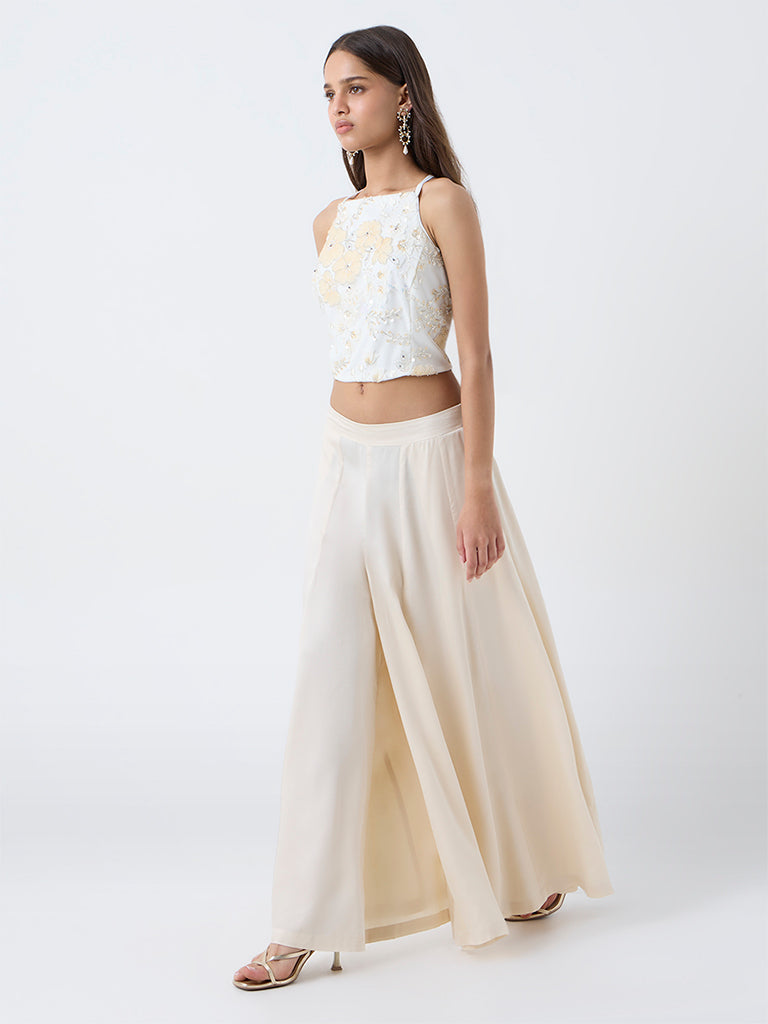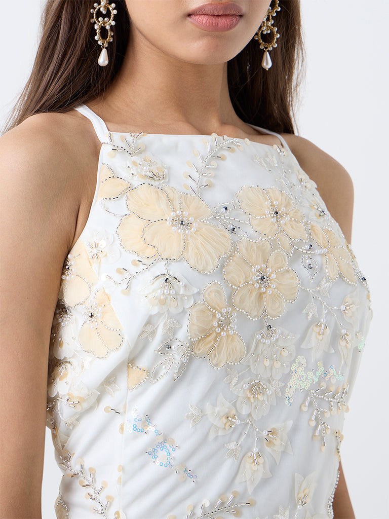 An understated yet striking piece. this off-white ethnic blouse by Vark is tailored with a structured square neckline and a sleeveless cut for effortless grace. The floral embroidery. touched with delicate embellishments. lends a subtle festive shimmer. Finished with a concealed back zipper. it pairs refined craftsmanship with all-day comfort.