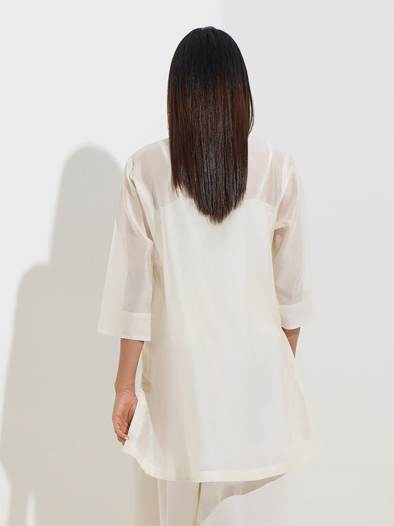 This off-white kurti with inner from Vark is decorated with intricate floral embellishments for a regal touch. Spun from a lightweight fabric for uninterrupted comfort. it includes a classic collar that extends to a button placket and three-quarter sleeves. The matching inner ensures comfortable coverage.