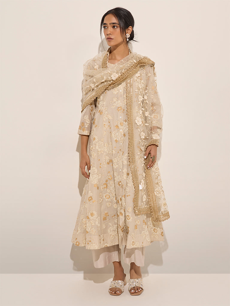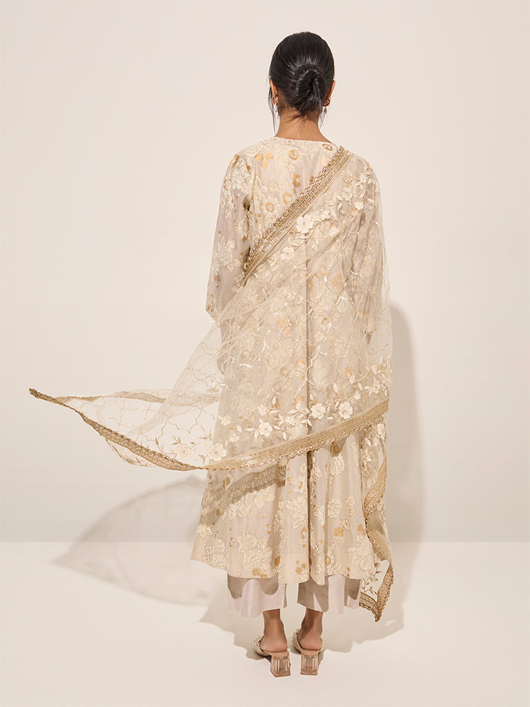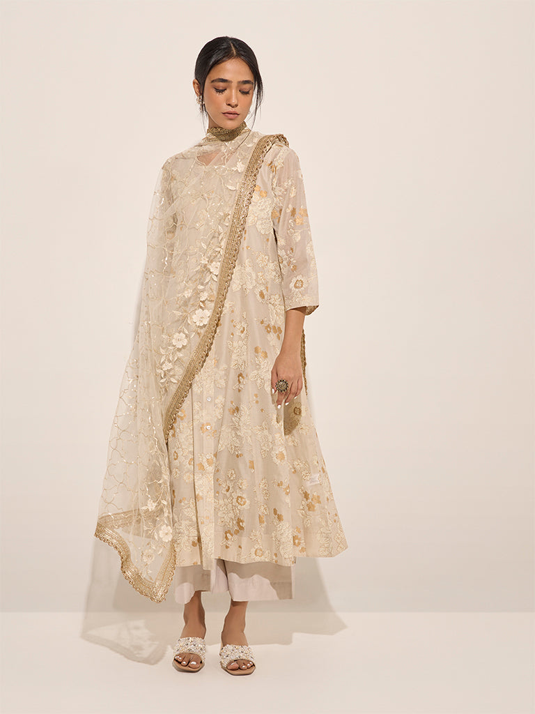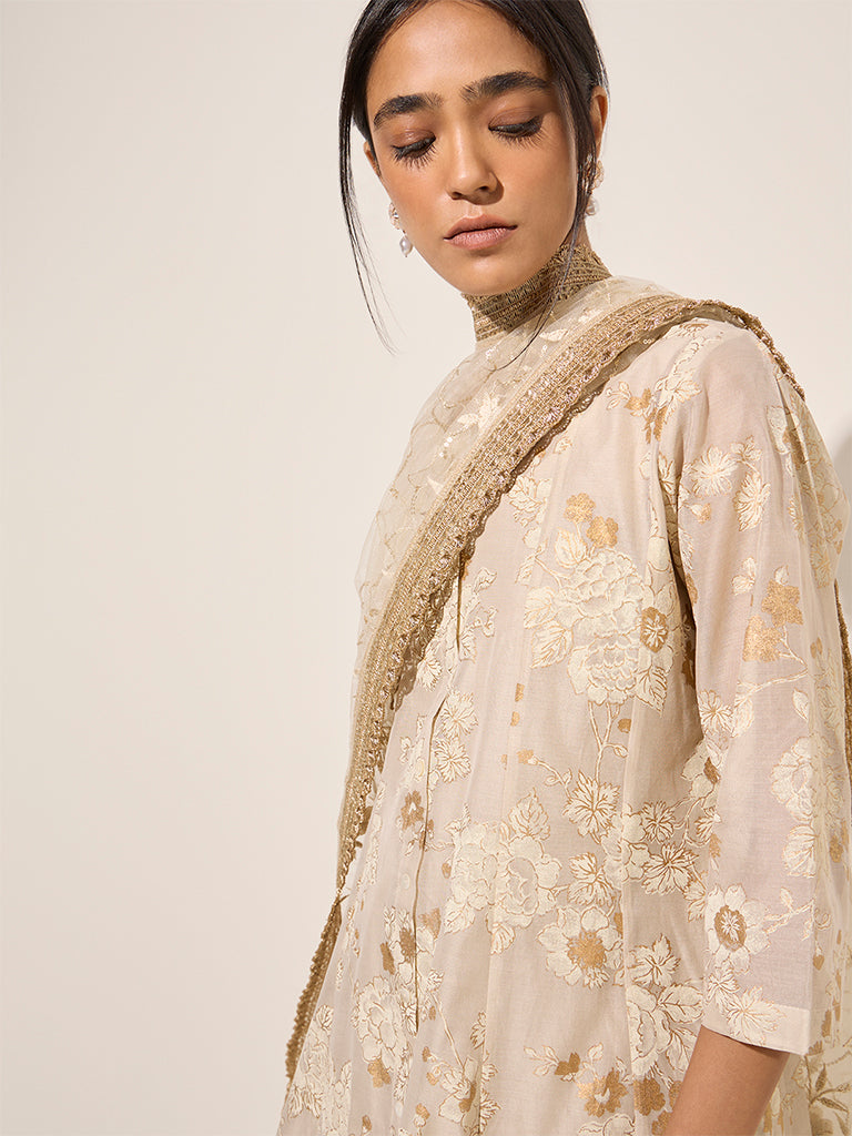Vark presents this elegant off-white floral printed set. perfect for festive gatherings. The A-line kurta features a round neck. button-down front. and full sleeves. showcasing a delicate floral print. The supersoft inner with a round neck and sleeveless cut ensures a comfortable wear. It is paired with high-rise palazzos designed with a smooth elastic waistband for comfort. The look is completed with a net dupatta adorned with matching floral prints and a thick zari-embroidered hemline. adding a touch of sophistication.