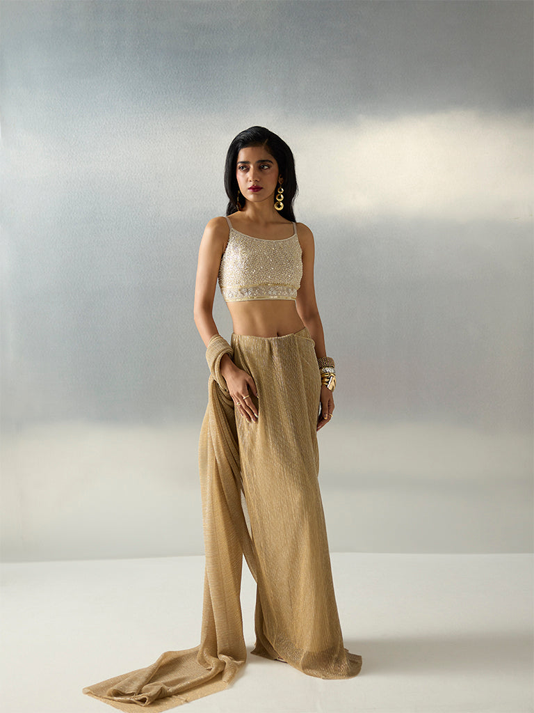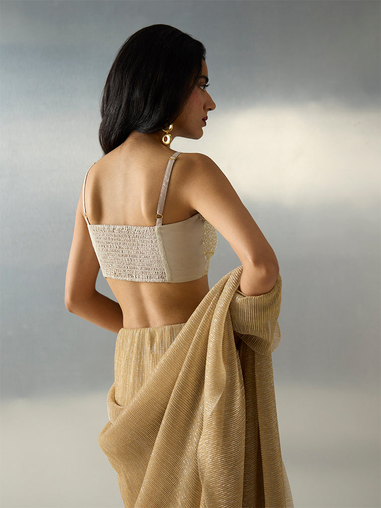 This off-white blouse from Vark is detailed with sequin embellishments on a sheer mesh overlay for a luminous touch. The neat square neckline and flexible smocked back make it a versatile addition to your festive wardrobe.