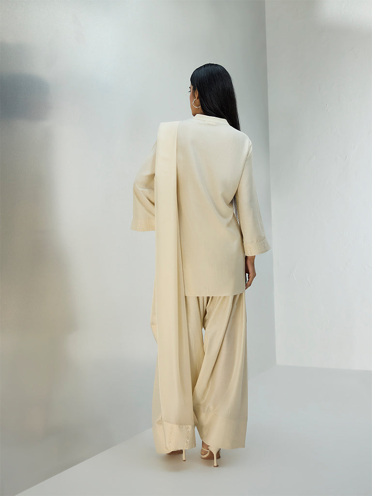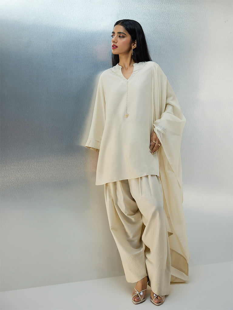 Float through celebrations in effortless elegance with this off-white ethnic set from Vark. Tailored from a lightweight fabric for all-day comfort. the A-line kurta features understated embellishments. a chic split neck. and graceful bell sleeves. Coordinated patiala-style salwar with an elasticated drawstring waist ensures ease of movement. while the soft dupatta drapes with festive sophistication.
