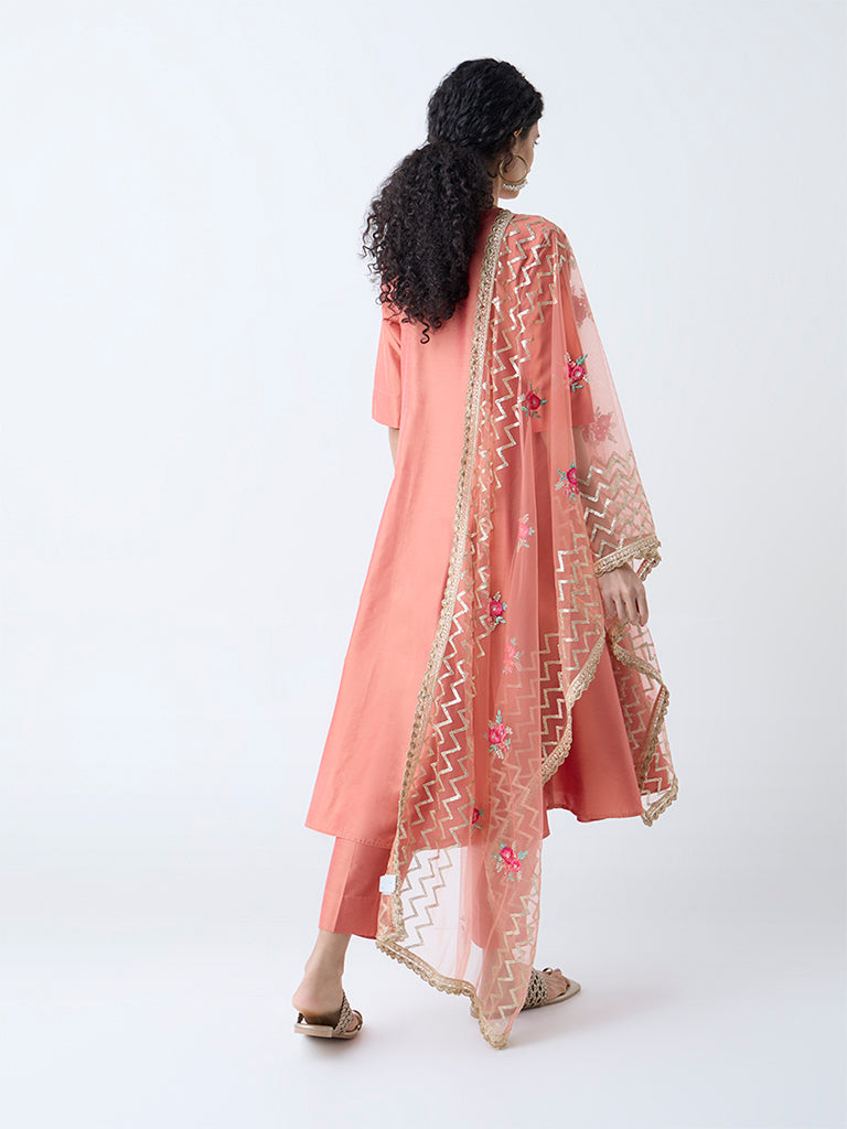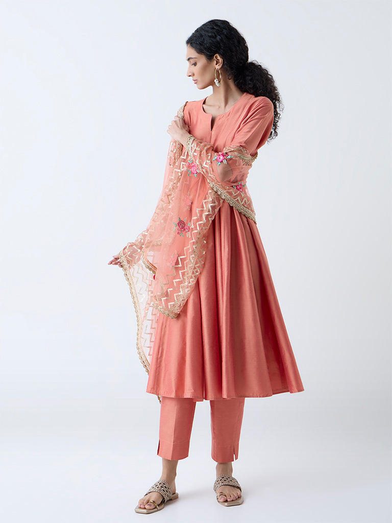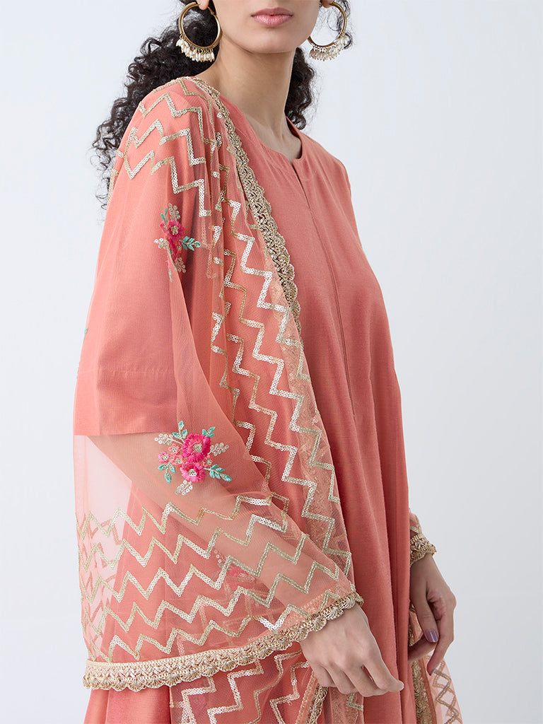 Radiate festive charm in this orange ethnic set from Vark. anchored by an Anarkali-style kurta featuring a split neck and half sleeves. Made from a lightweight fabric for maximum comfort. the set includes coordinated ethnic pants with an elasticated waistband for effortless movement. A sheer net dupatta. adorned with vibrant floral embroidery and chevron patterns. adds the perfect touch of festive elegance to complete the look.