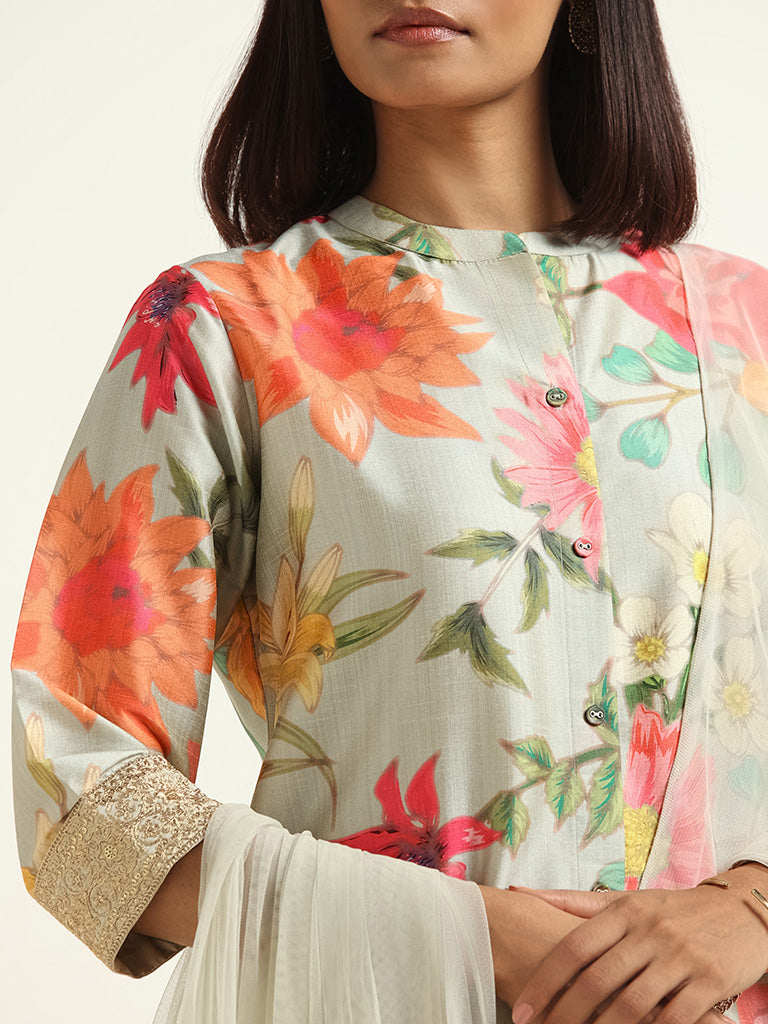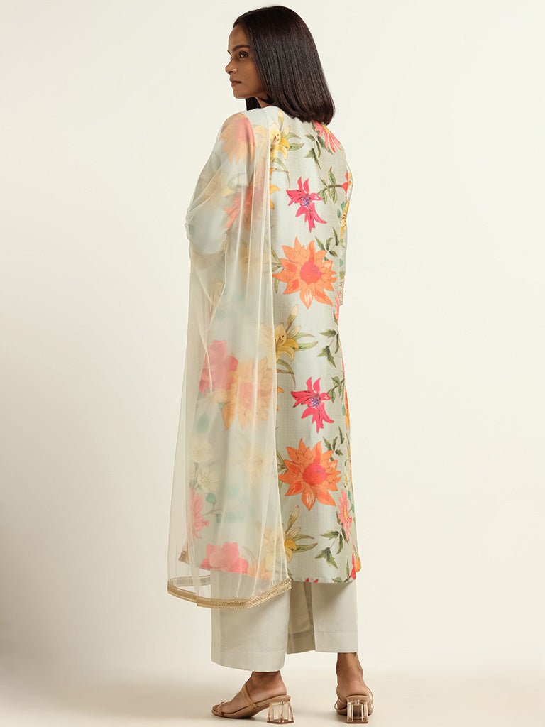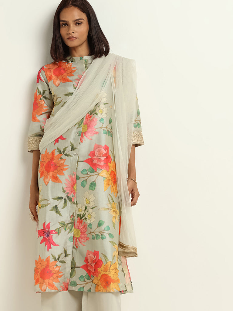 Wear elegance with the Vark set. Embrace the bold floral print in pale blue. featuring a band neckline. button-down style. three-quarters sleeves kurta. paired with plain palazzos. and a netted embroidered bordered dupatta for a complete. sophisticated look.