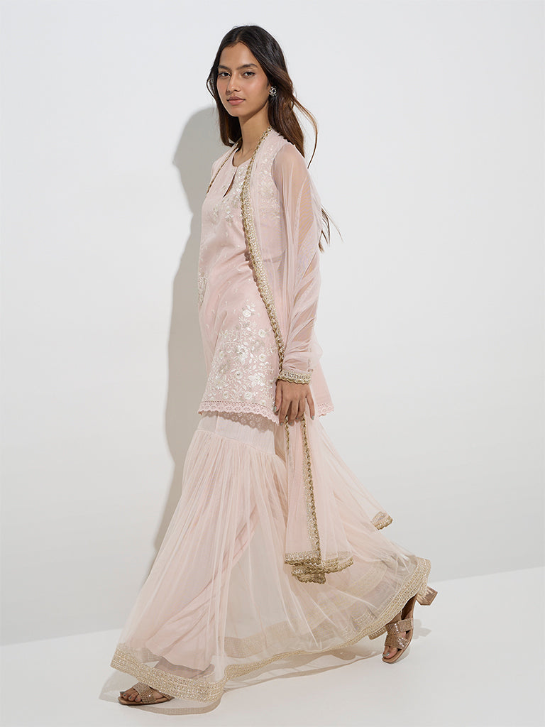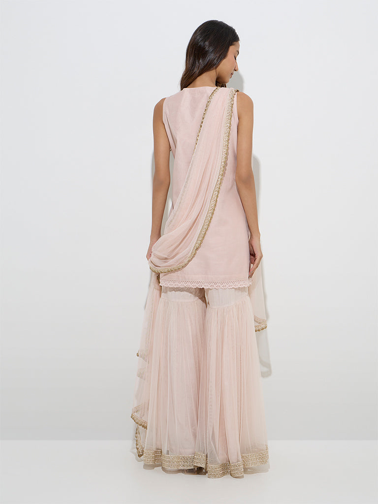 Vark Peach Cotton-Blend Kurti. Sharara and Dupatta Set