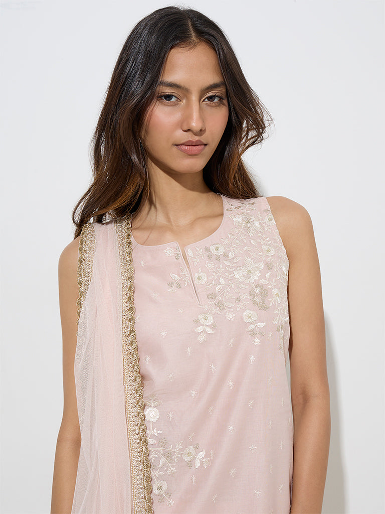 Add a soft glow to your festive wardrobe with this peach ethnic set from Vark. The straight kurta is adorned with intricate floral embroidery and styled with a split neckline and sleeveless silhouette. It’s paired with a flowy sharara featuring a delicate mesh overlay for added texture and flair. A lightweight net dupatta with gold-toned zari trims completes the ensemble.