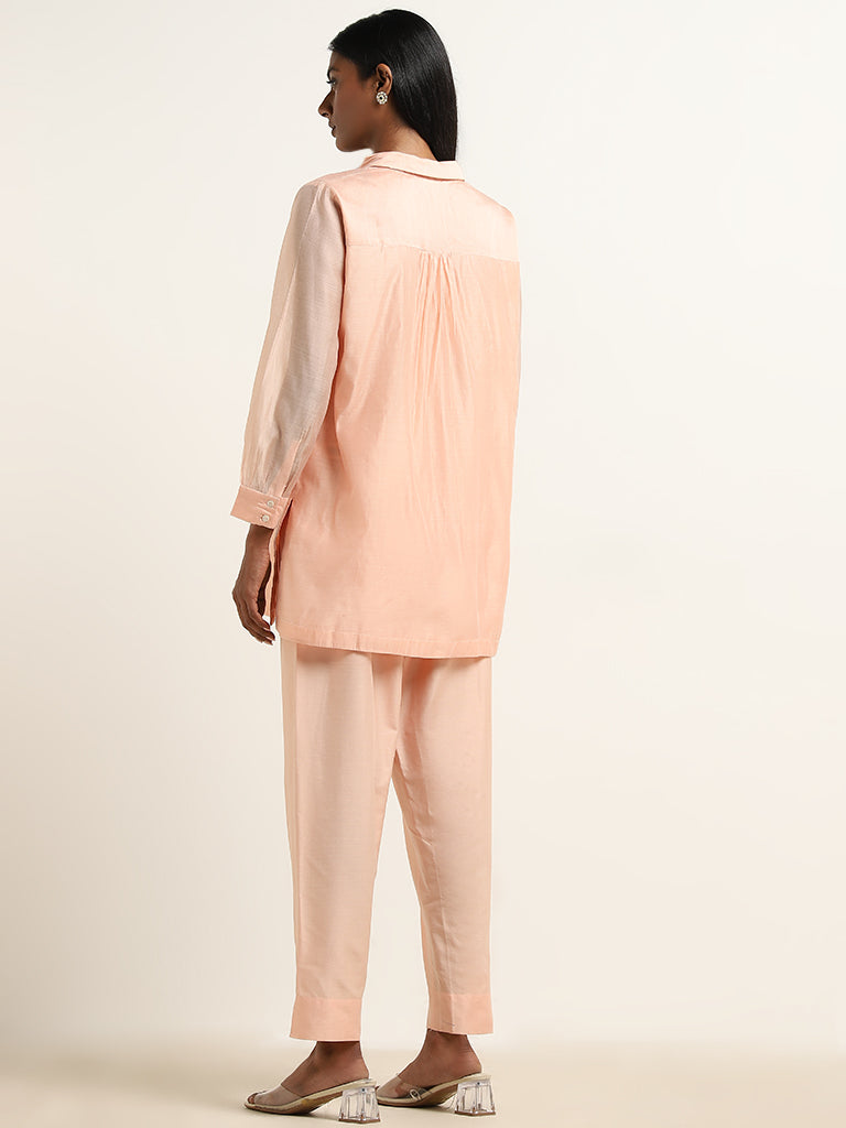 Vark Peach Floral Embroidered Straight Tunic & Ethnic Pants Set