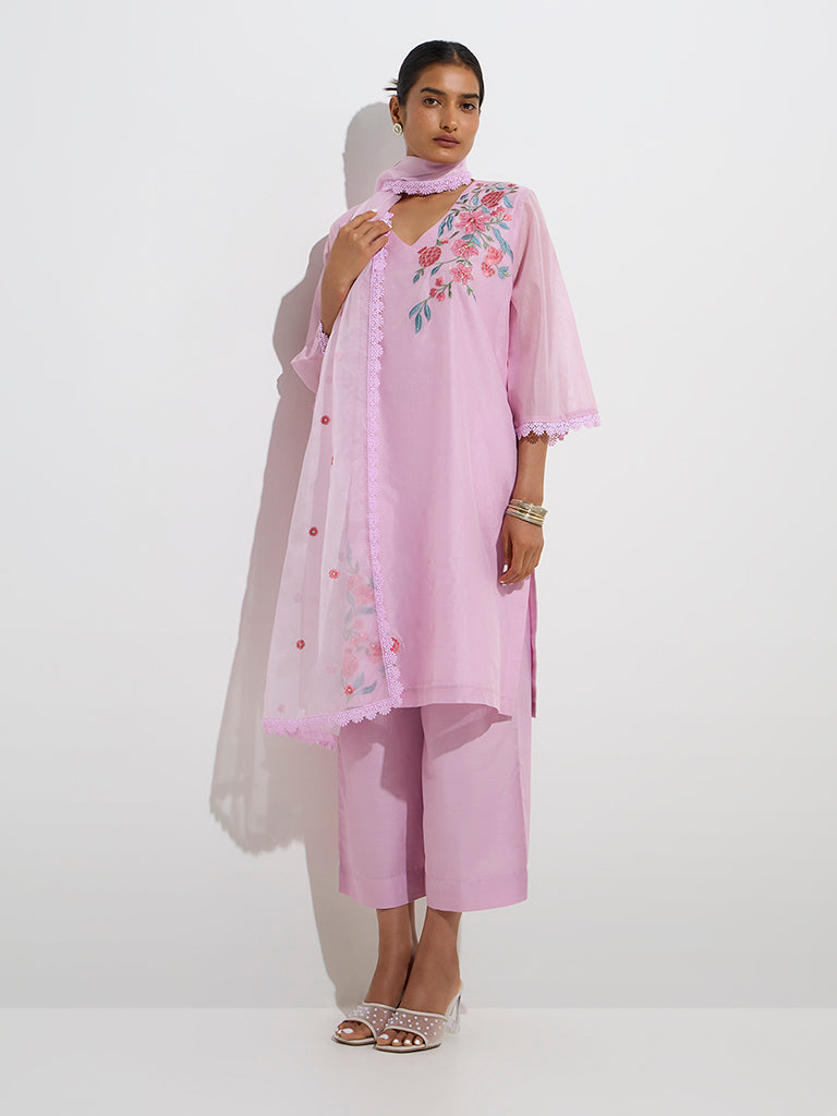 Vark Pink Cotton Straight Kurta. Ethnic Pants Dupatta Set