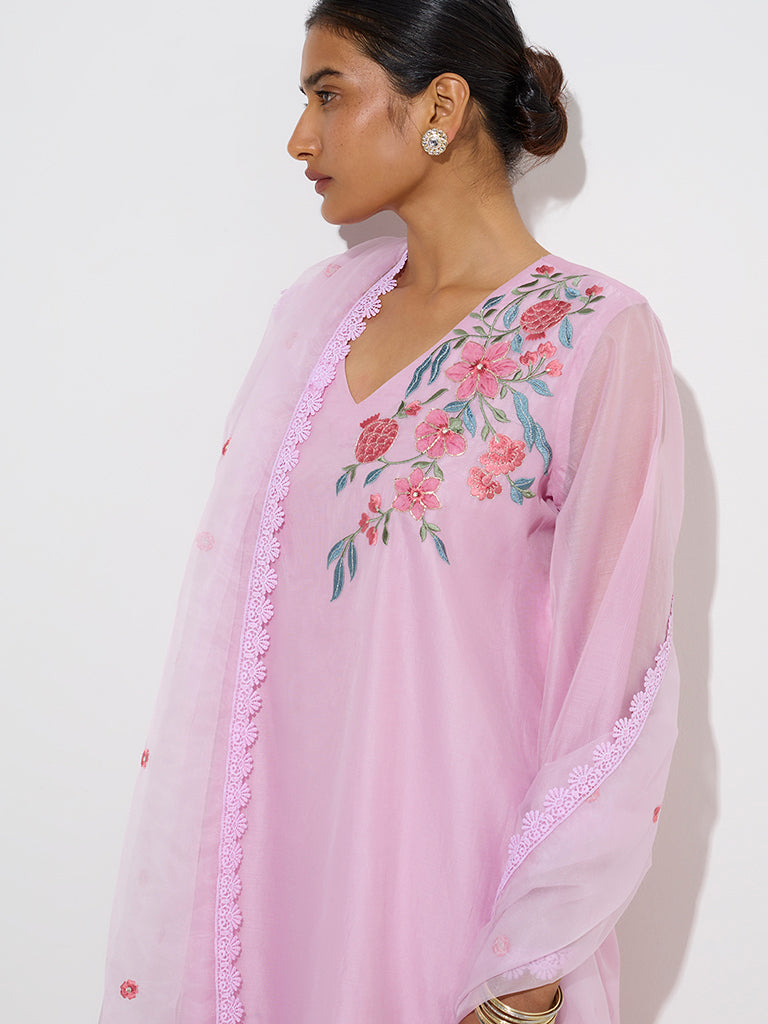 This pink ethnic set from Vark is a perfect blend of elegance and tradition. The kurta is beautifully adorned with intricate floral embroidery and carries a flattering V-neck and organza sleeves with delicate lace trims. The matching ethnic pants are designed for comfort with an elasticated waistband. while the dupatta adds a finishing touch with its exquisite floral borderwork.