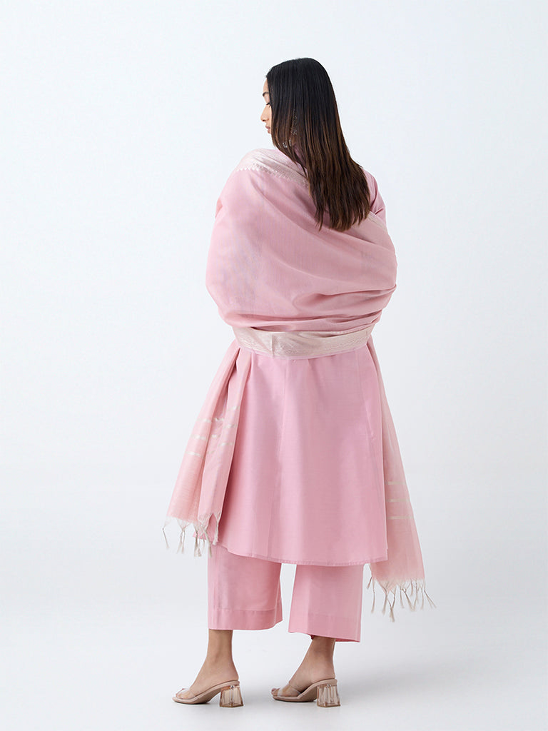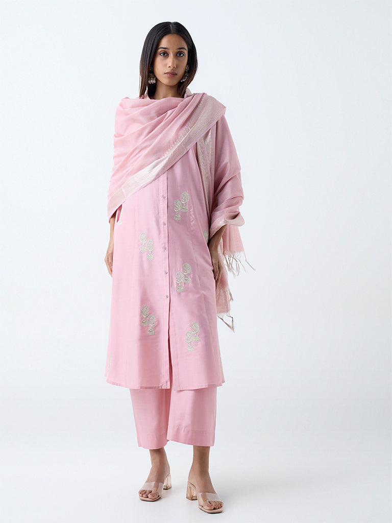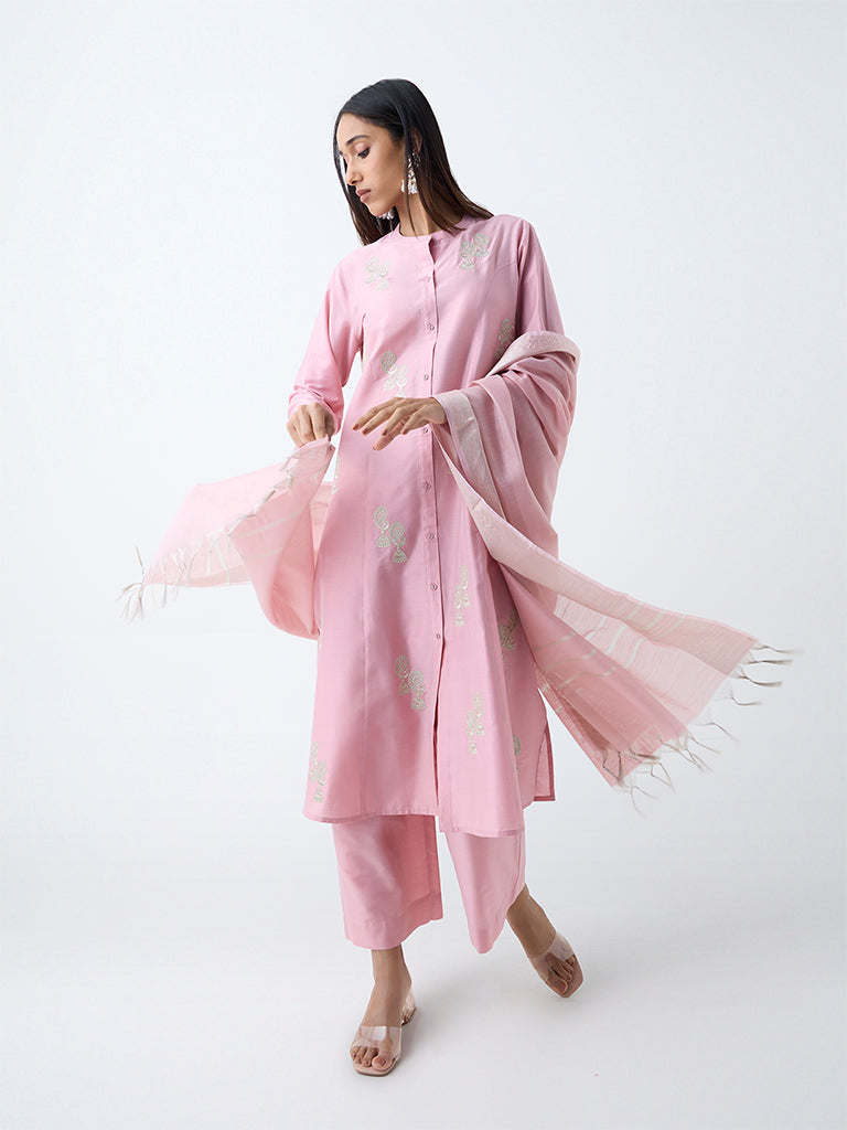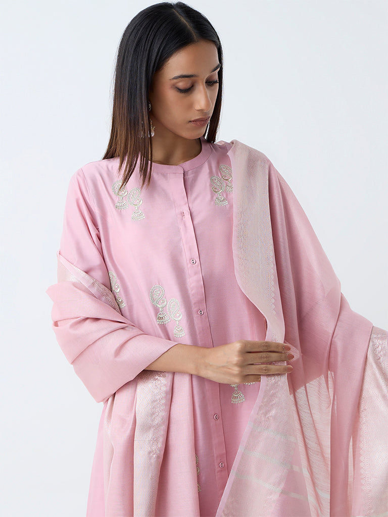 Turn heads this festive season with this pink ethnic set from Vark. designed to bring charm and elegance to every celebration. The A-line kurta steals the spotlight with its intricate gold-toned jhumka embroidery. while a band collar. button placket. and three-quarter sleeves lend a tailored finish. Paired with matching ethnic pants featuring a smooth elasticated waistband. the ensemble is completed with a coordinated dupatta adorned with zari trims and playful fringes at the hem for added flair.