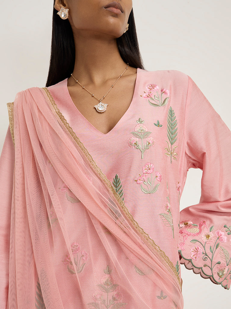 Vark Pink Floral Embroidered Kurta. Pants and Dupatta Set