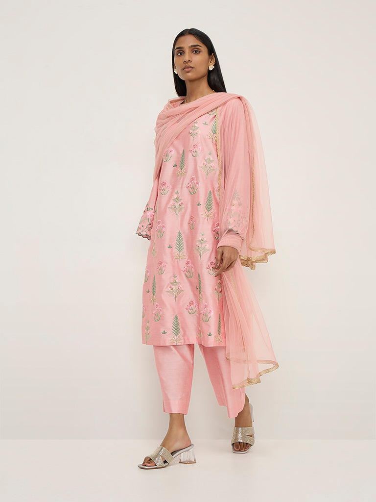 Vark presents this pink kurta set adorned with floral embroidery. Made from quality fabric. the straight cut kurta boasts a V-neck and full sleeves. It is paired with high-rise palazzos offering a smooth elastic waistband and net-fabric dupatta. adorned with zari borders.