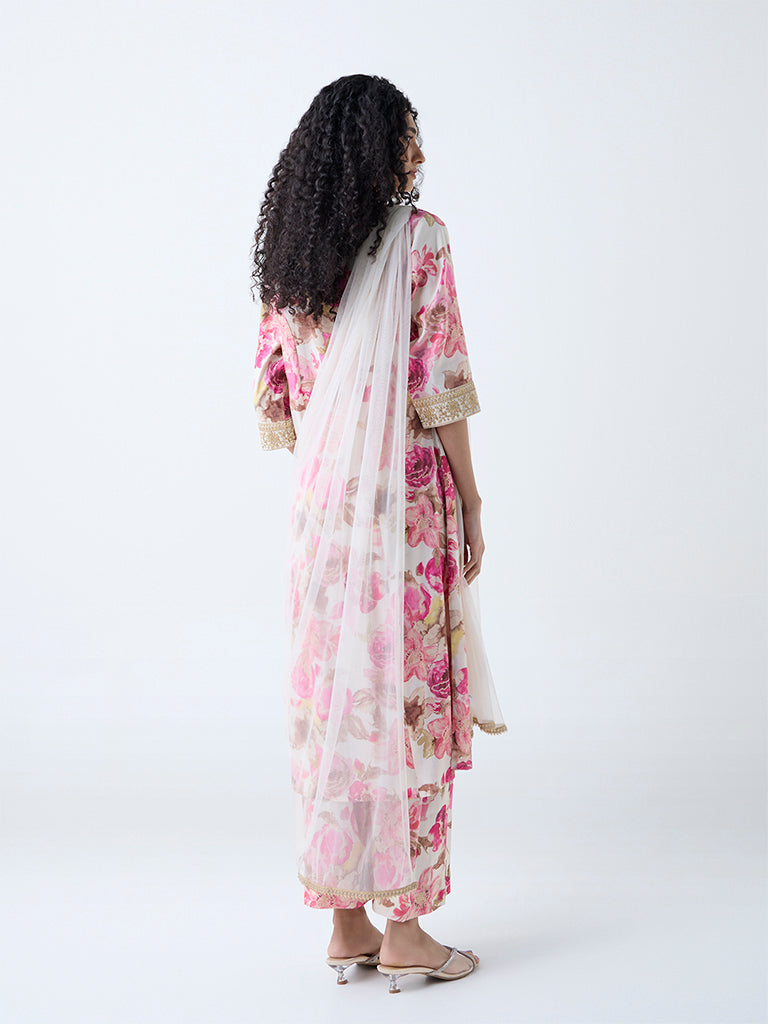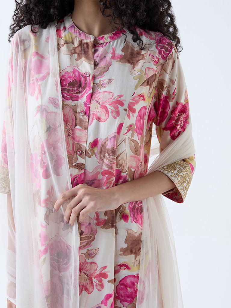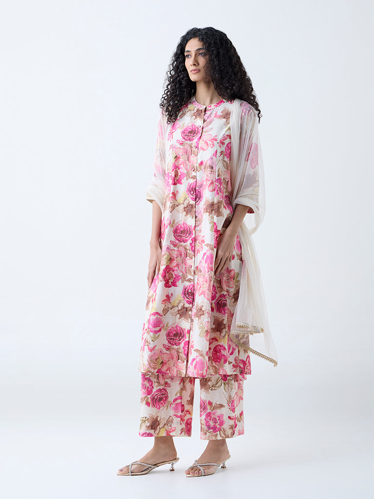 This pink ethnic set from Vark blends vibrant tradition with contemporary flair. The A-line kurta is adorned with vivid floral prints and comes fitted with a band collar. buttoned placket. and three-quarter sleeves. Paired with coordinated palazzos designed with an elasticised waistband for a custom fit. the look is completed with a soft net dupatta.