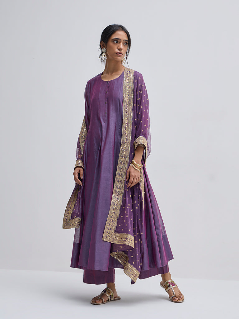 Vark presents this purple ethnic set featuring a kurta. ethnic pants and a dupatta. The fit-and-flare kurta flaunts a zari border on the three-quarter sleeves. a glossy hue and a split-crew neckline. The netted dupatta with embellished borders and a pair of high-rise ethnic pants complete this elegant ethnic set.