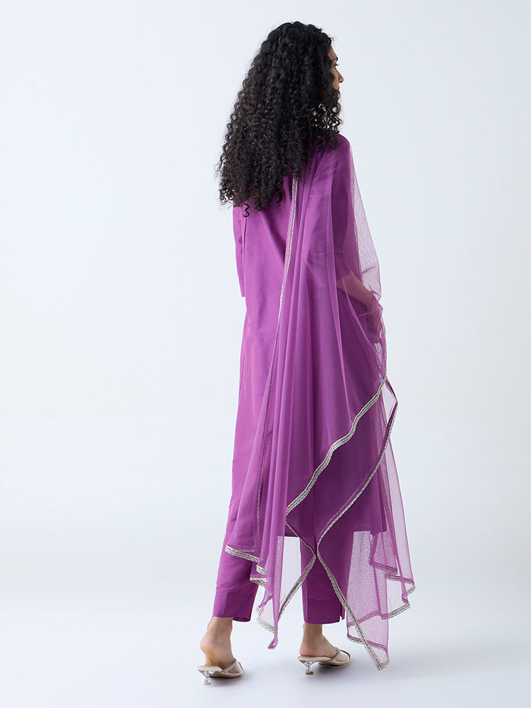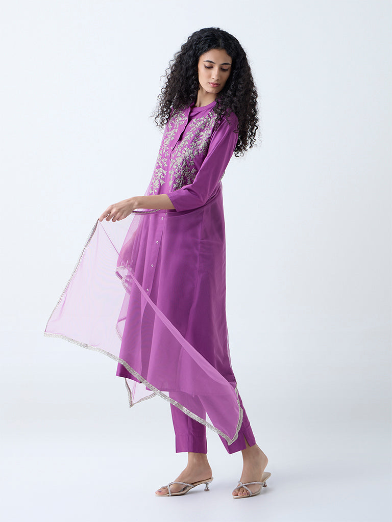 Vark launches this purple ethnic set. crafted from a breathable fabric to deliver comfort without compromising on detail. The A-line kurta stands out with intricate leaf embroidery and is framed by a mandarin collar and three-quarter sleeves. It’s paired with easy-fitting ethnic pants and a sheer net dupatta that adds movement and lightness to your ensemble.