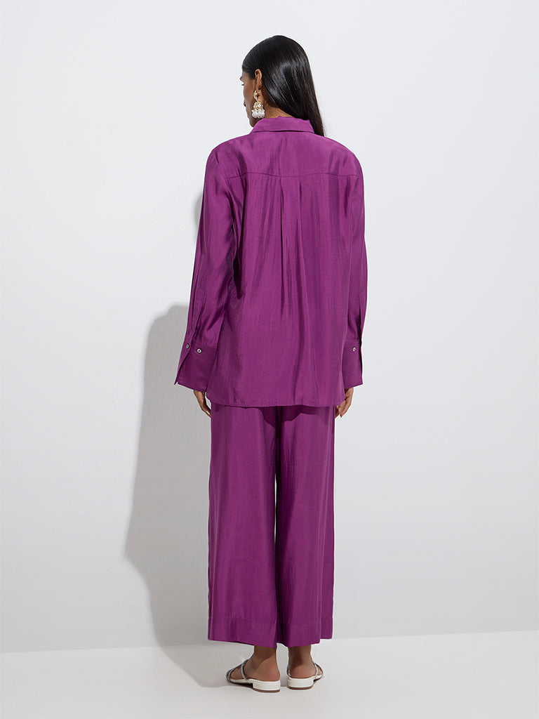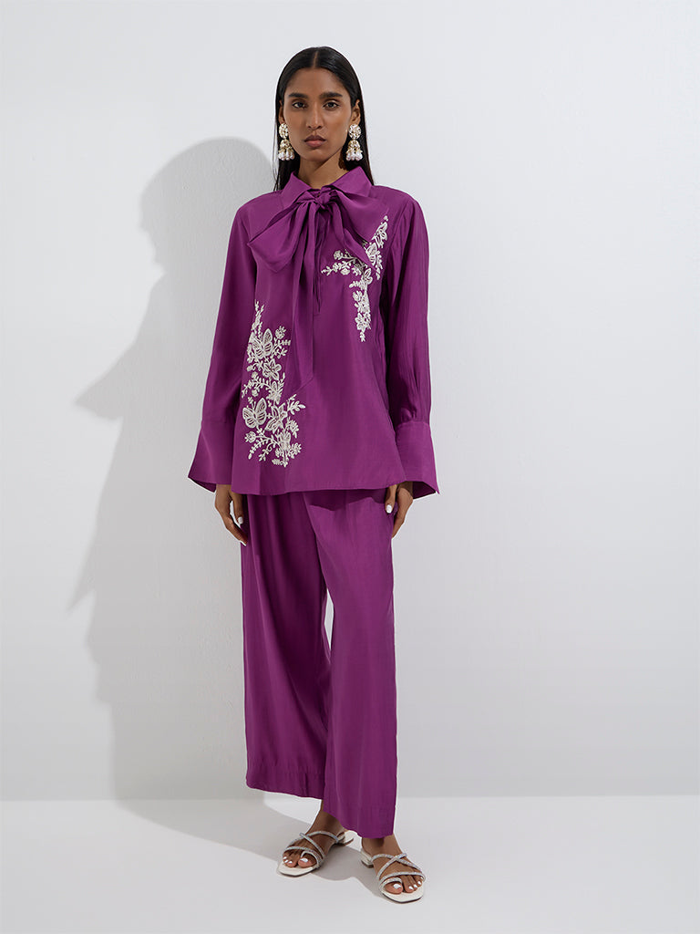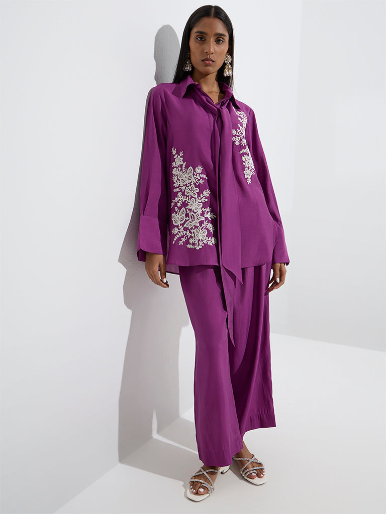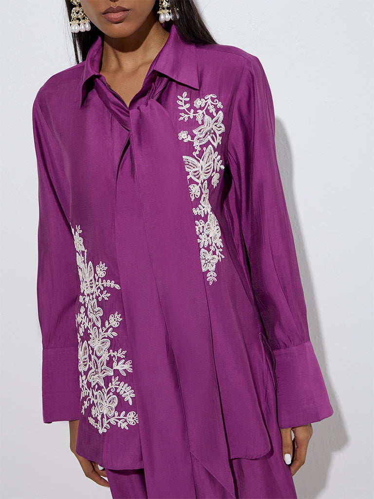 Vark launches this graceful purple set. featuring an ethnic kurti adorned with intricate floral embroidery. The collar flows into a concealed button placket. while full sleeves lend a polished finish. Paired with matching ethnic pants and a coordinating sash that can be styled around the neck. this ensemble brings effortless elegance to any occasion.