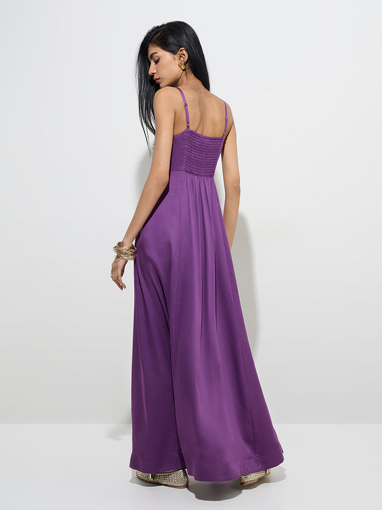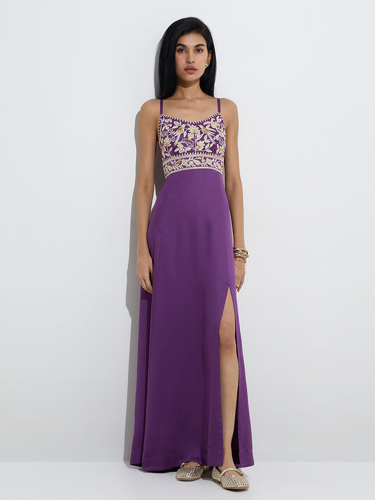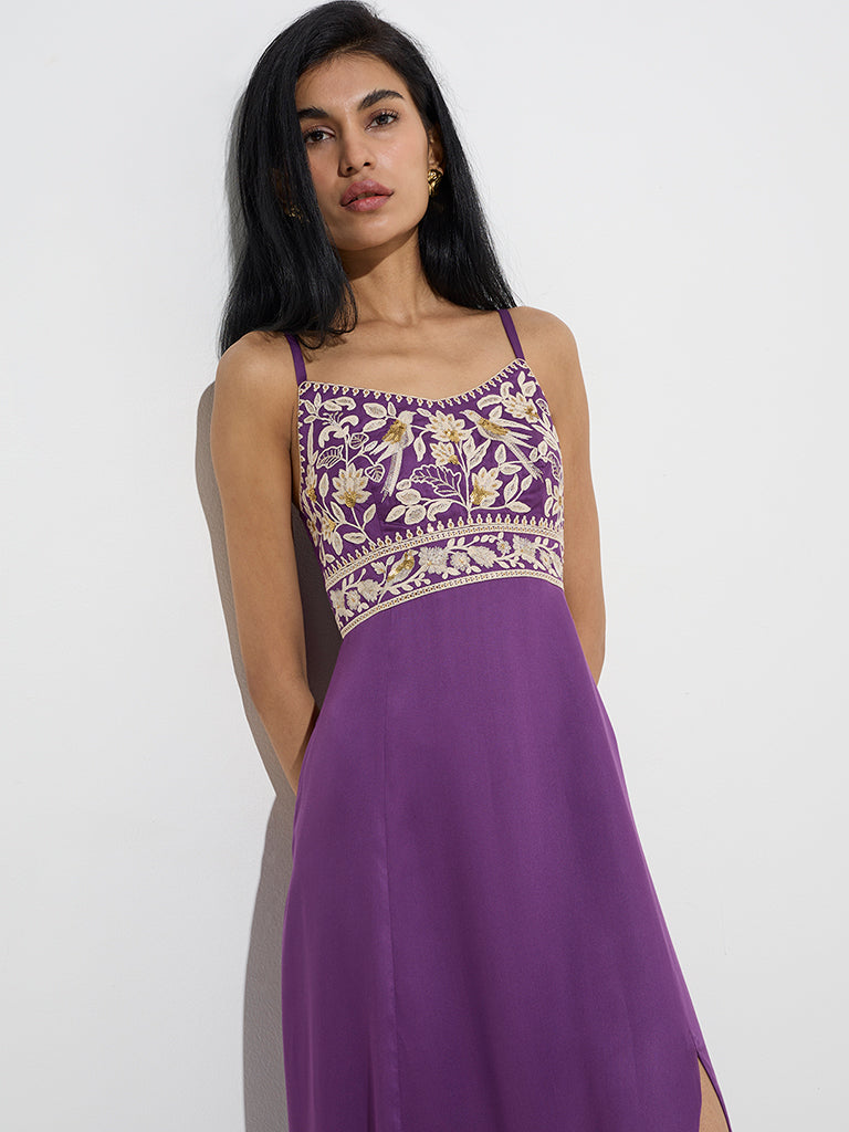 This purple dress from Vark spotlights a beautifully embroidered floral bodice. Spun from a lightweight fabric. it is styled with a scoop neckline. adjustable shoulder straps. and a smocked back for a comfortable fit. The stylish slit and functional side pockets complete this chic and versatile piece.