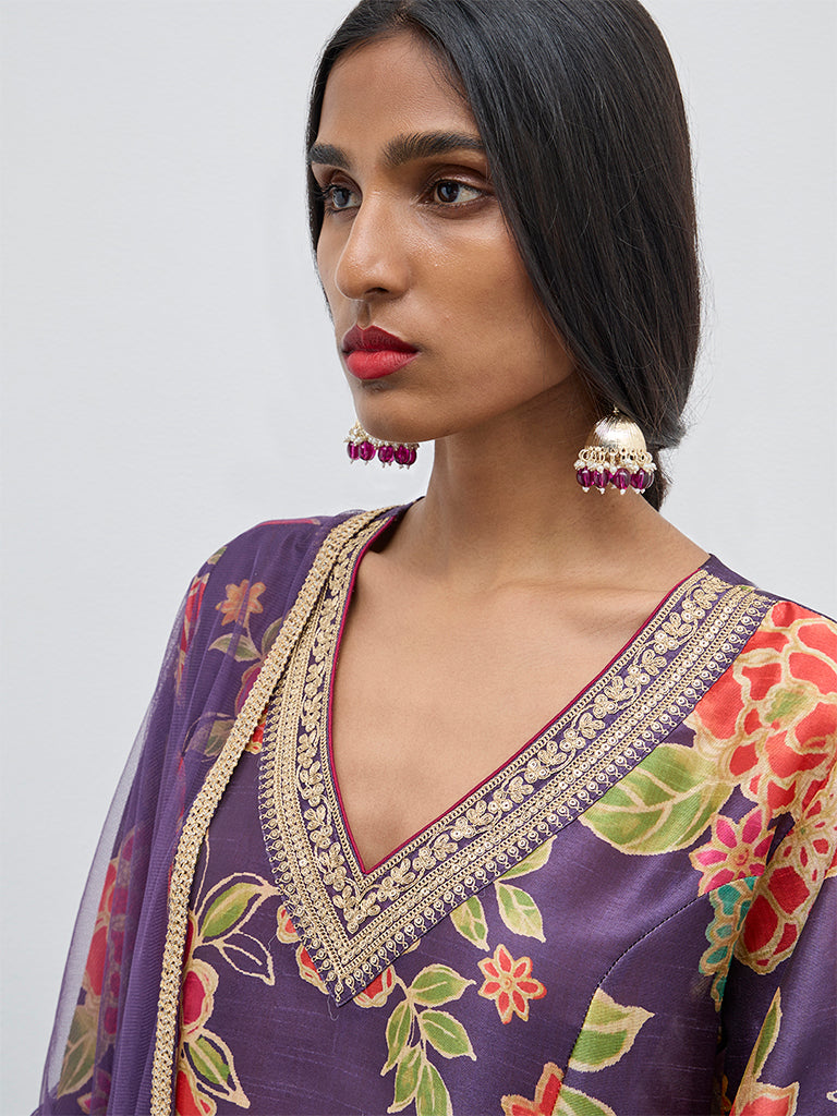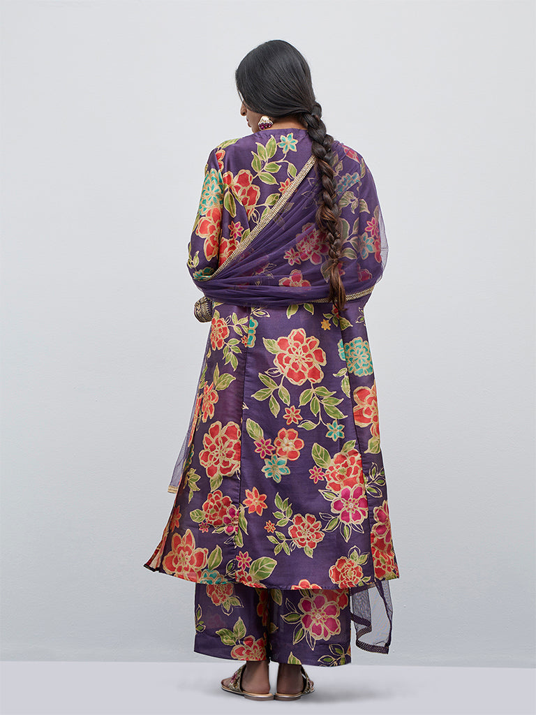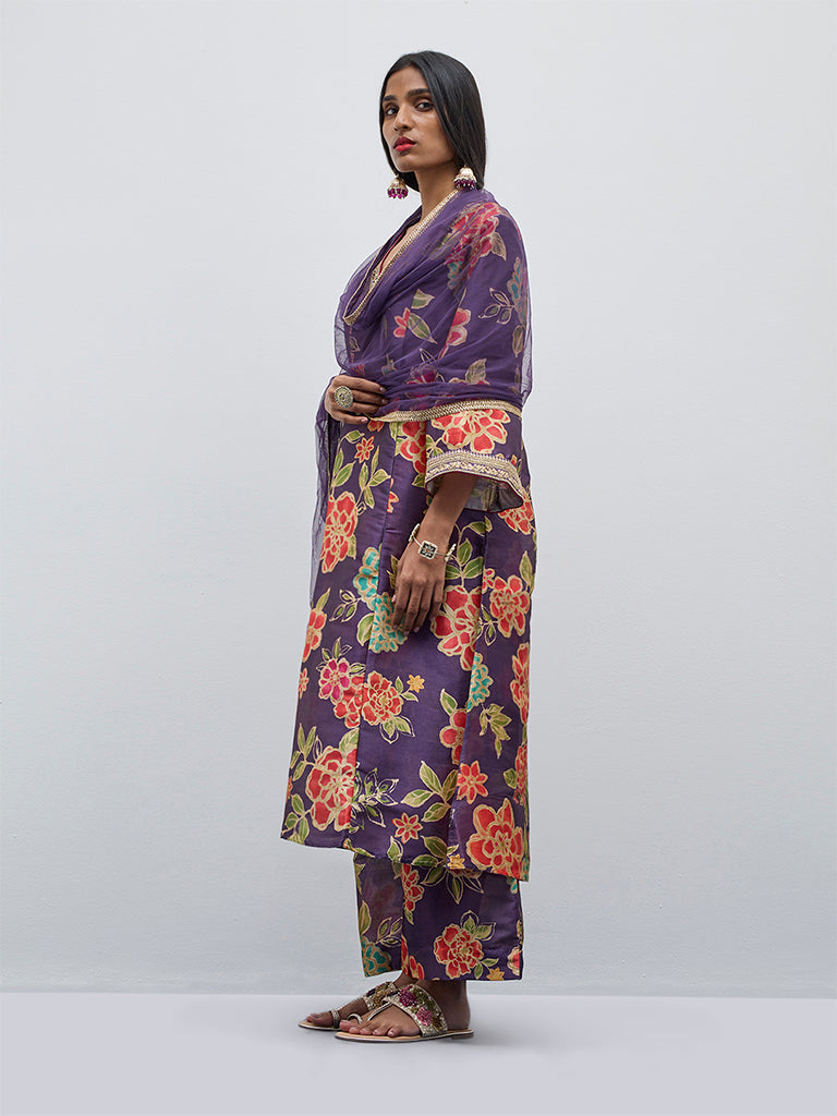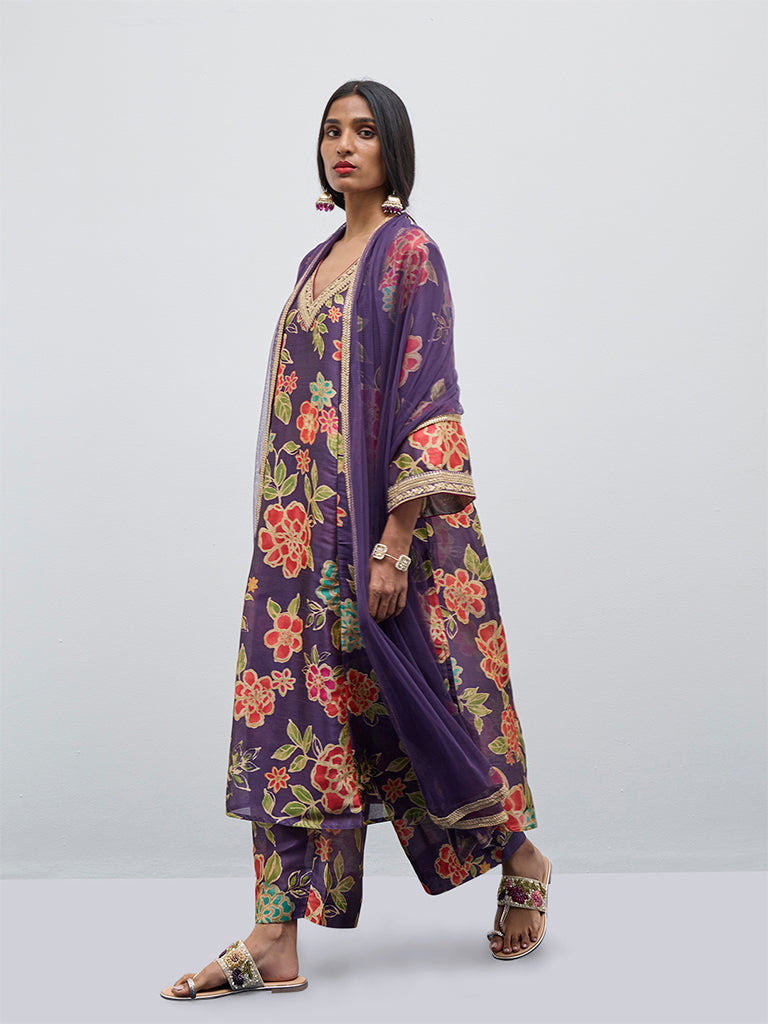 Vark Purple Floral Printed A-Line Kurta. Palazzos and Dupatta Set