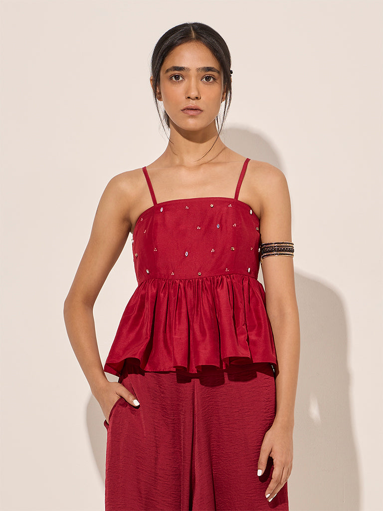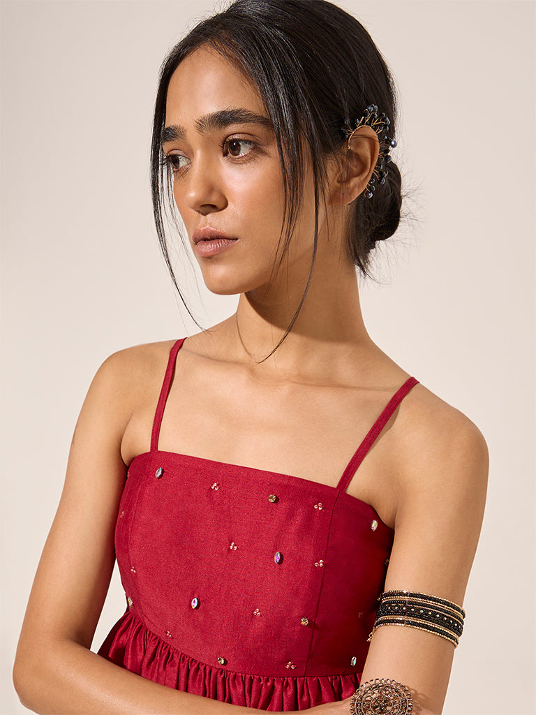 Vark presents this red blouse featuring an embellished bodice. Crafted from soft and breathable fabric. it flaunts elegant pleated detailing. The garment ensures a perfect fit with its smocked back. square neck and adjustable shoulder straps.