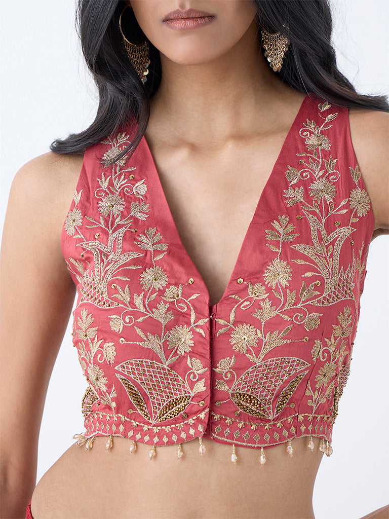 This red blouse from Vark features embellished embroidery all over. creating a richly detailed surface. Designed in a sleeveless profile with a plunge neck. it includes tie-up tassel details at the neck for added definition and a hook-up back for a secure fit. The hem is finished with beaded accents that bring movement to the silhouette. making this blouse an elegant match for flared skirts or layered sarees.