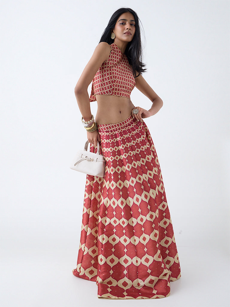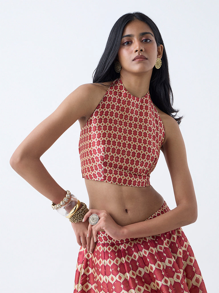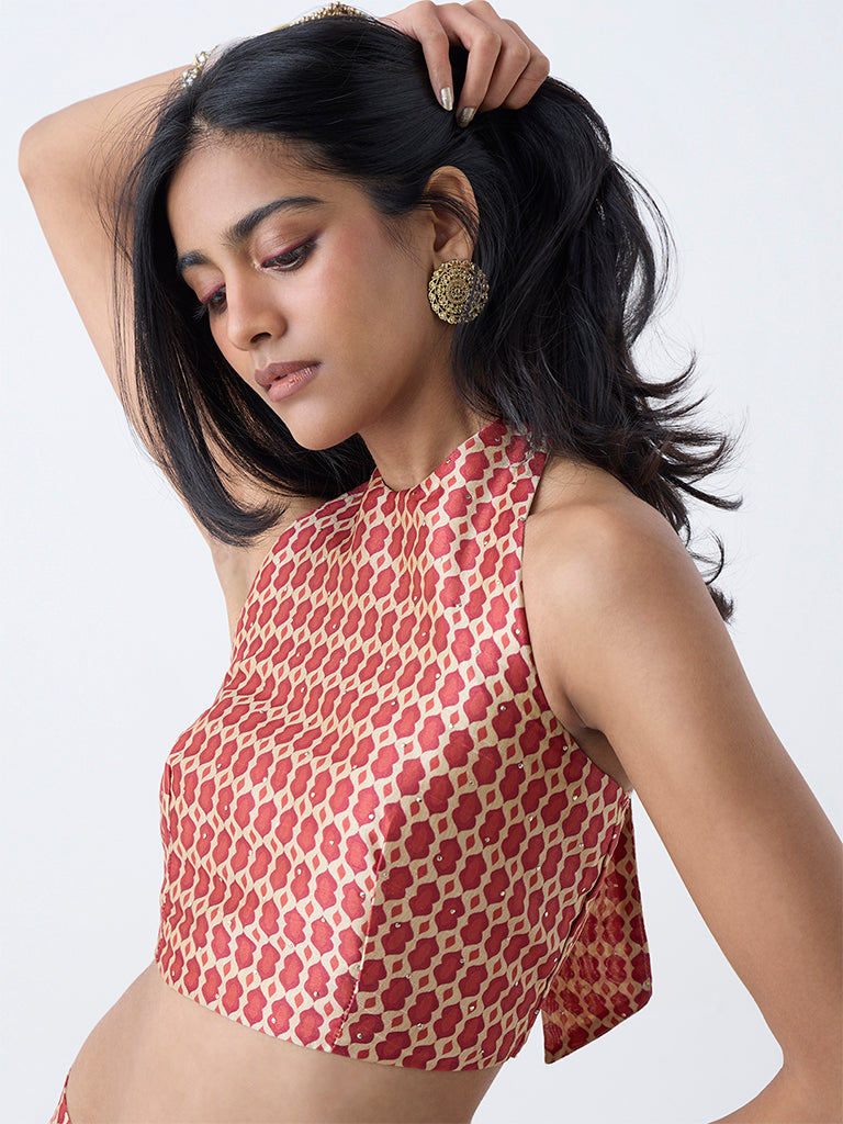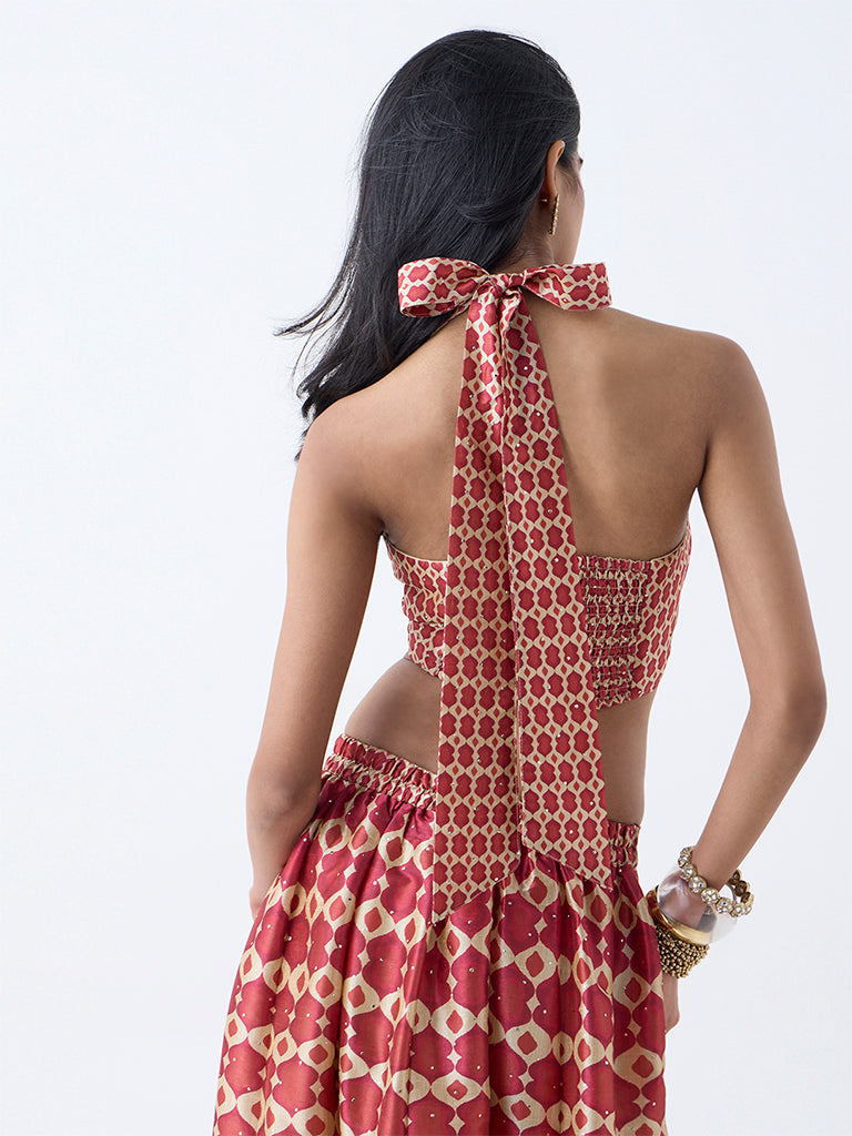 Vark introduces this red top. showcasing eye-catching prints on a soft and premium fabric. It is designed with a flexible smocked back and a flattering halter-neck with a tie-up design. The lightweight construction and breezy cut makes it ideal for festive gatherings