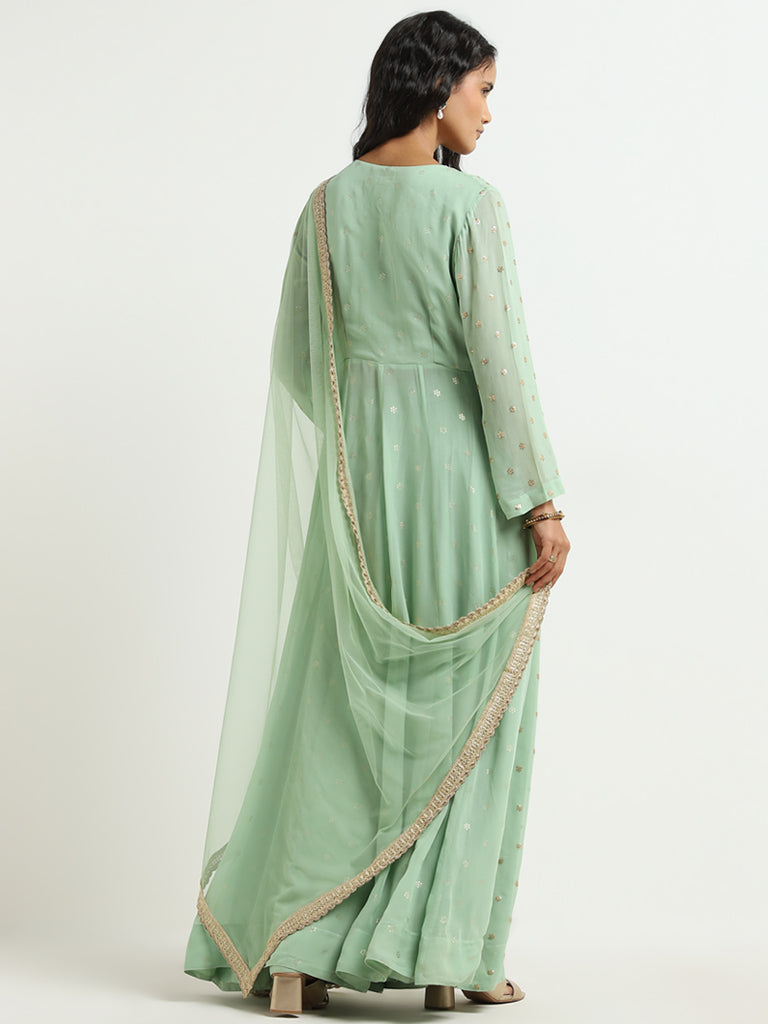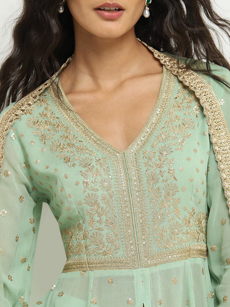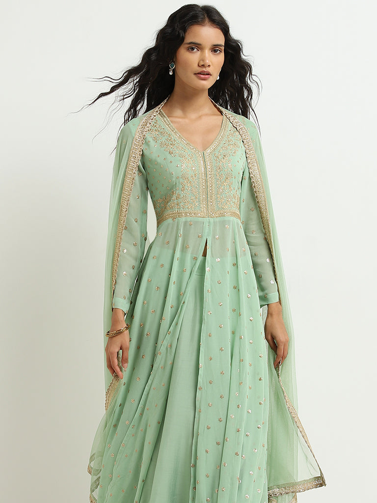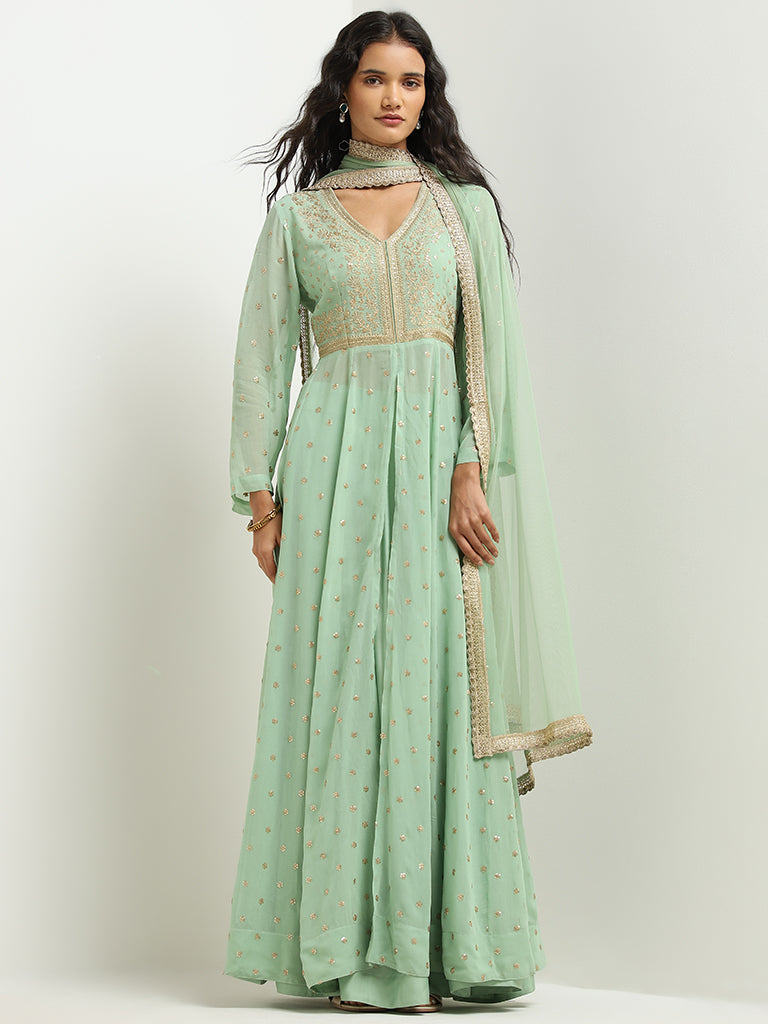 Vark Sea Green Embellished Kurta. Skirt and Dupatta Set